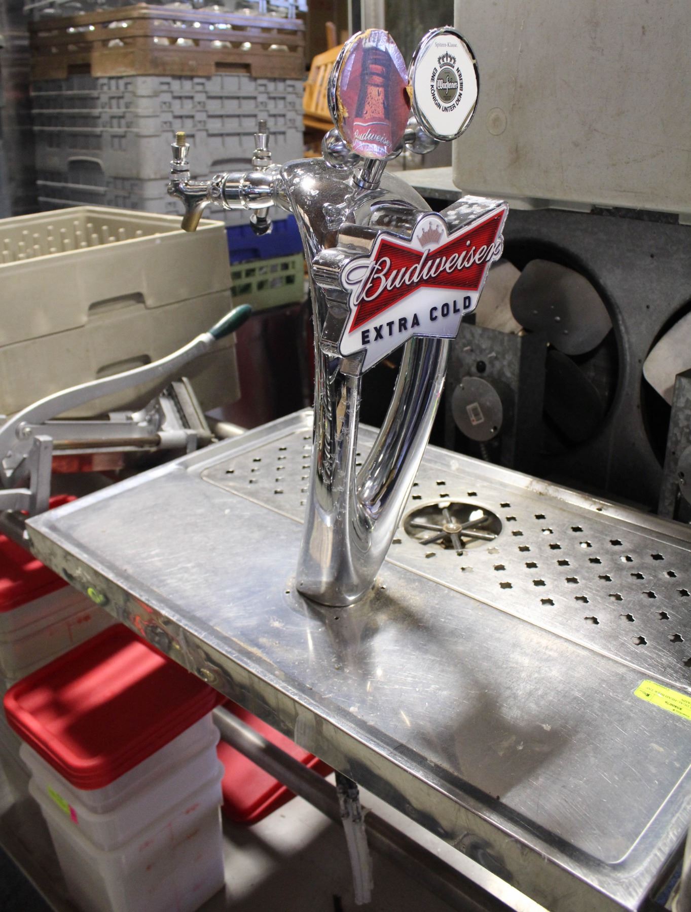 BUDWISER DUAL-HEAD BEER TAP W/ DRAIN BASIN. 20X31.5X24