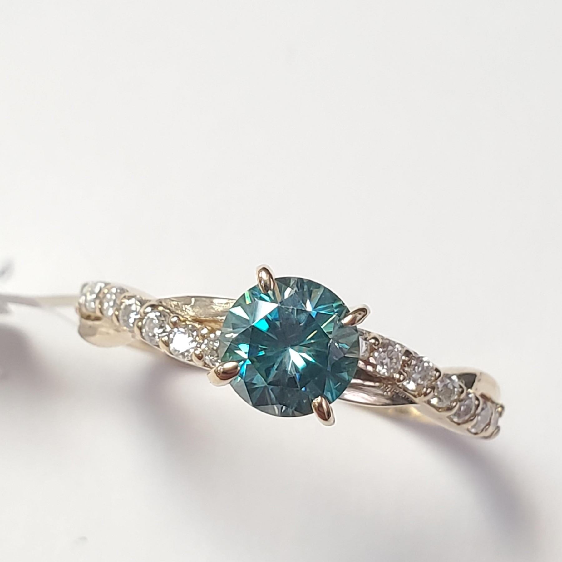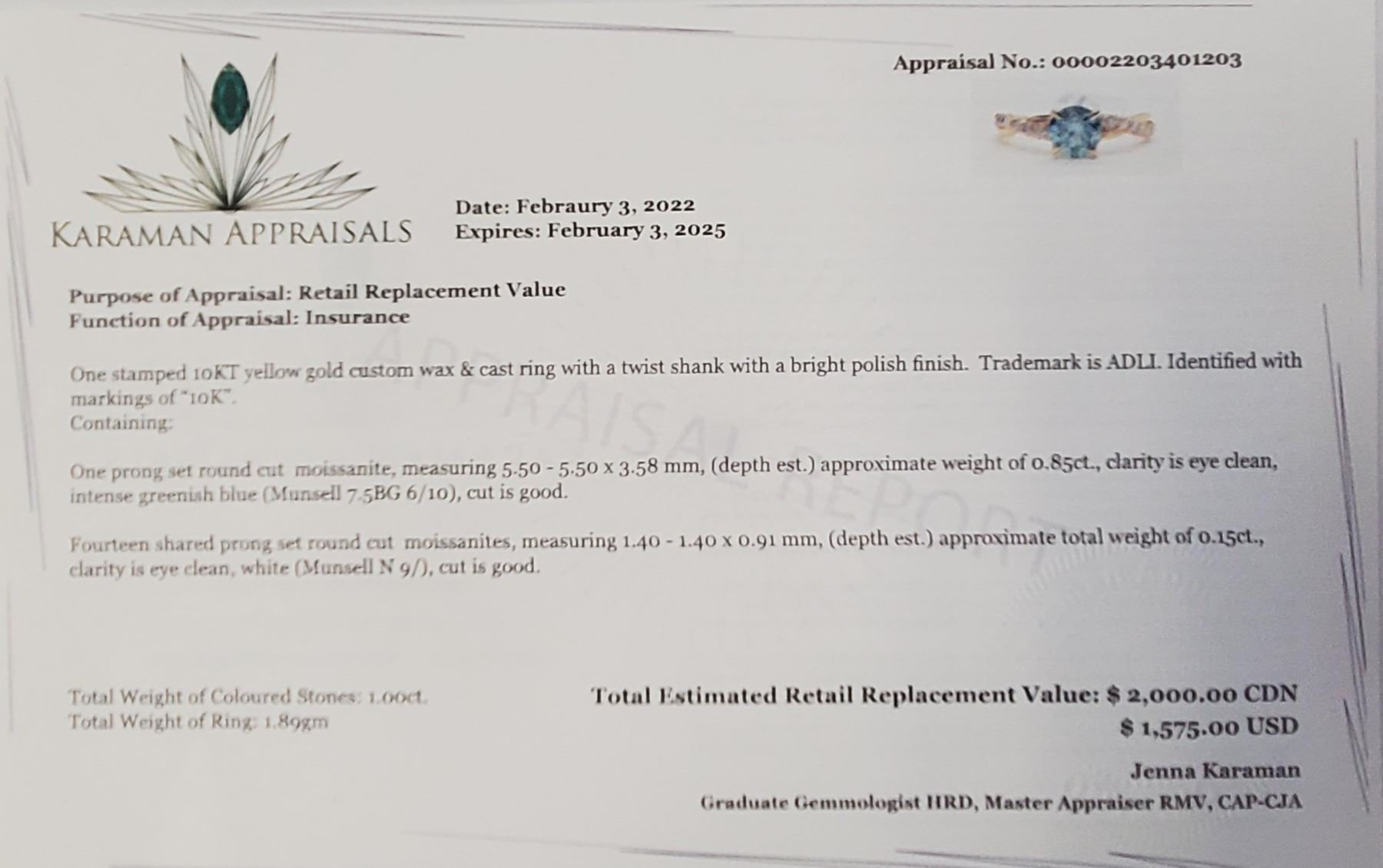 10K YELLOW GOLD GREENISH BLUE MOISSANITE(0.85CT) WHITE MOISSANITE (0.15CT) RING SIZE 7 (RING IS RESIZABLE FOR $40) (~LENGTH INCHES) (~WEIGHT 1.89G), MADE IN CANADA, APPRAISED RETAIL $2000