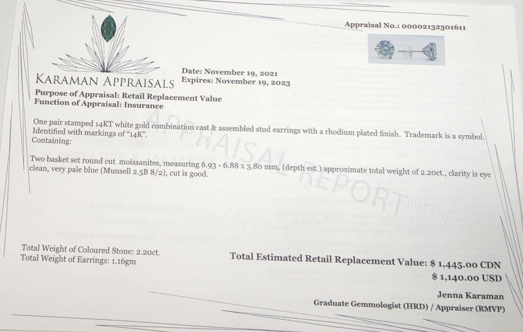 10K WHITE GOLD MOISSANITE(2.2CT) EARRINGS (~WEIGHT 1.16G), MADE IN CANADA, APPRAISED RETAIL $1445