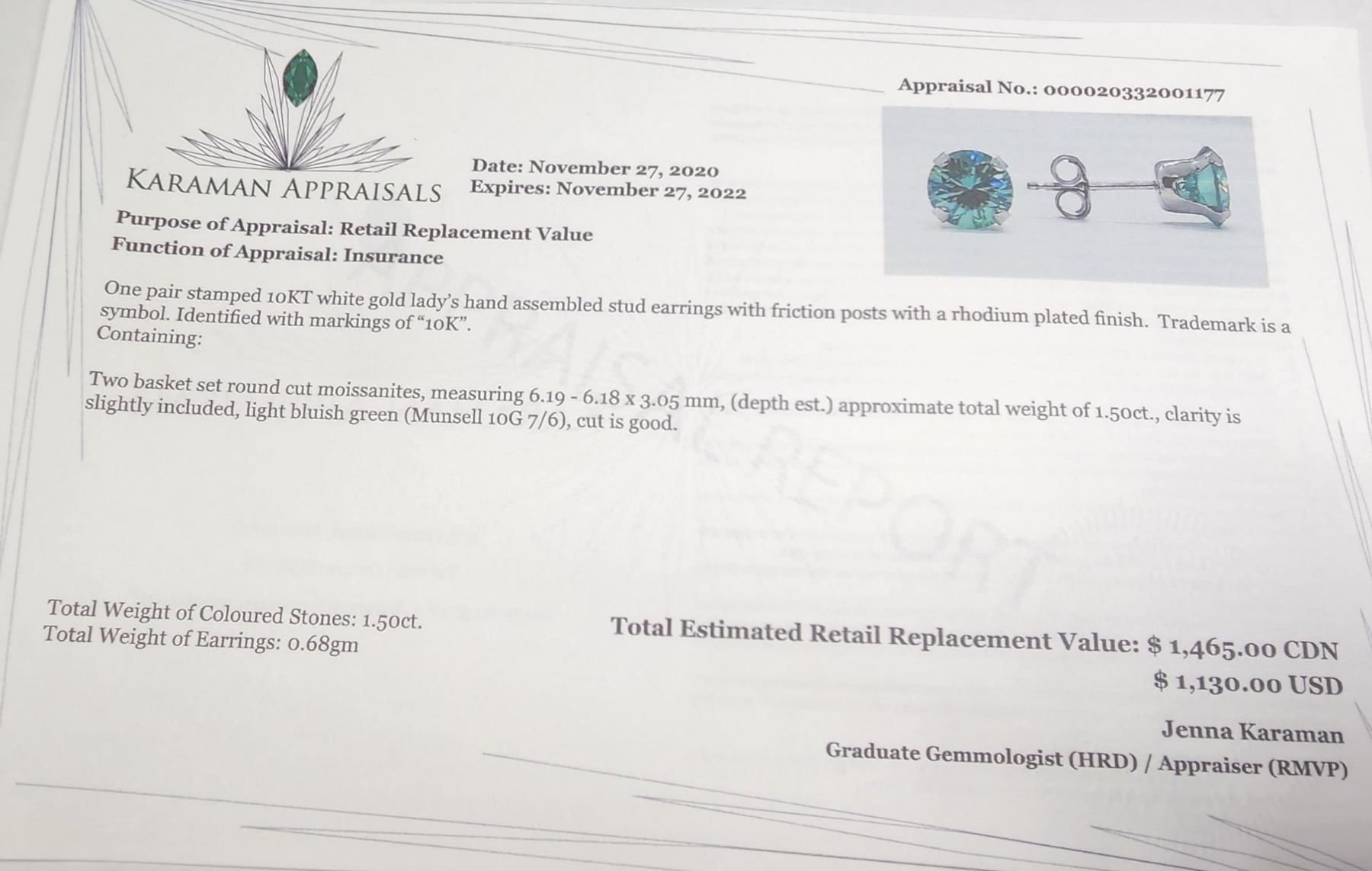 10K WHITE GOLD MOISSANITE(1.5CT) EARRINGS (~WEIGHT 0.68G), MADE IN CANADA, APPRAISED RETAIL $1465