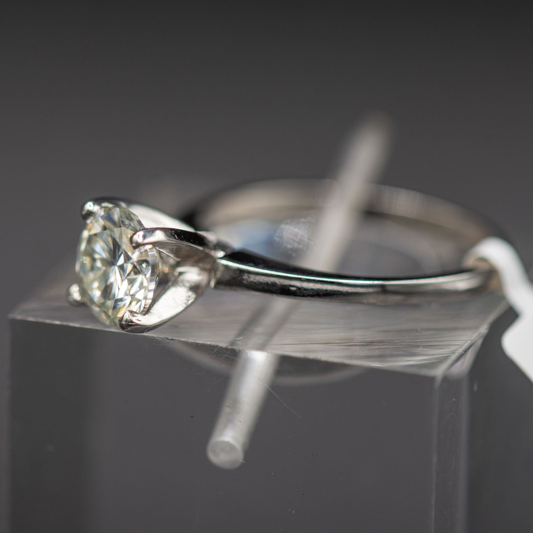 SOLITAIRE RING WITH A COMFORT FIT SHANK ON RHODIUM PLATED FINISH. TRADEMARK IS DSK, STAMPED 10KT. MOISSANITE MEASURING 6.60-6.53 X 3.90mm WITH APPROXIMATE 1.05CT. CLARITY IS EYE CLEAN, CUT IS GOOD. DOES NOT COME WITH COA