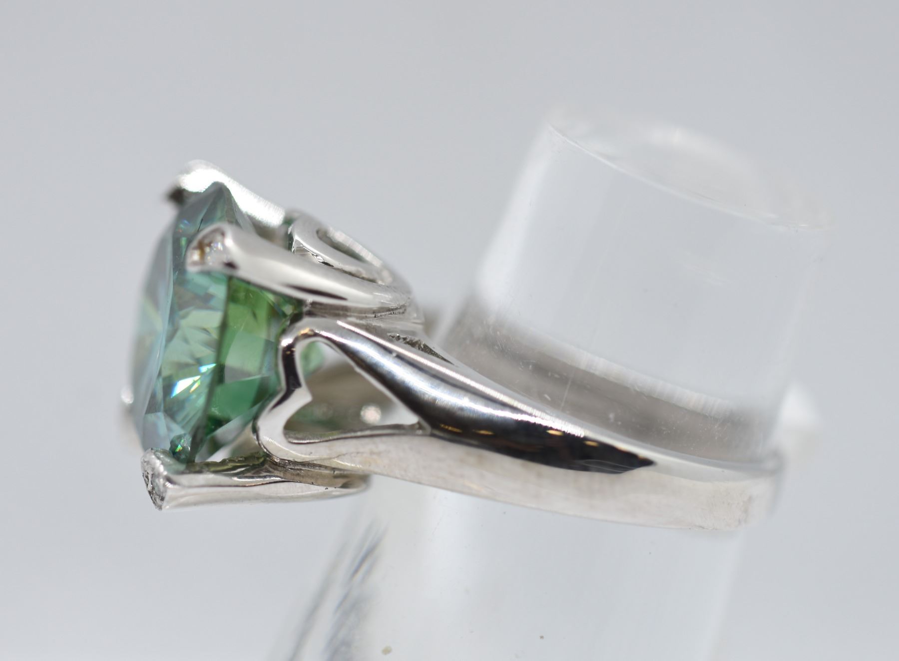AND DIAMOND RING 6.5. THE BRIGHT POLISHED MOUNT WITH A HEART DESIGN GALLERY IS FOUR PRONG SET WITH ONE ROUND BRILLIANT CUT SYNTHETIC TEAL BLUE COLORED MOISSANITE MEASURING 14.00-14.00 X 8.20MM. THE MOISSANITE WEIGHS APPROXIMATELY 10.00 CARATS. THE TOPS OF THE FOUR PRONGS ARE BEAD SET WITH FOUR ROUND BRILLIANT CUT DIAMONDS MEASURING 1.40MM. CLARITY GRADE SI-2. COLOUR GRADE G-H. WEIGHING IN TOTAL CARAT. TOTAL WEIGHT 6.10 GRAMS. APPRAISAL VALUE OF $1800