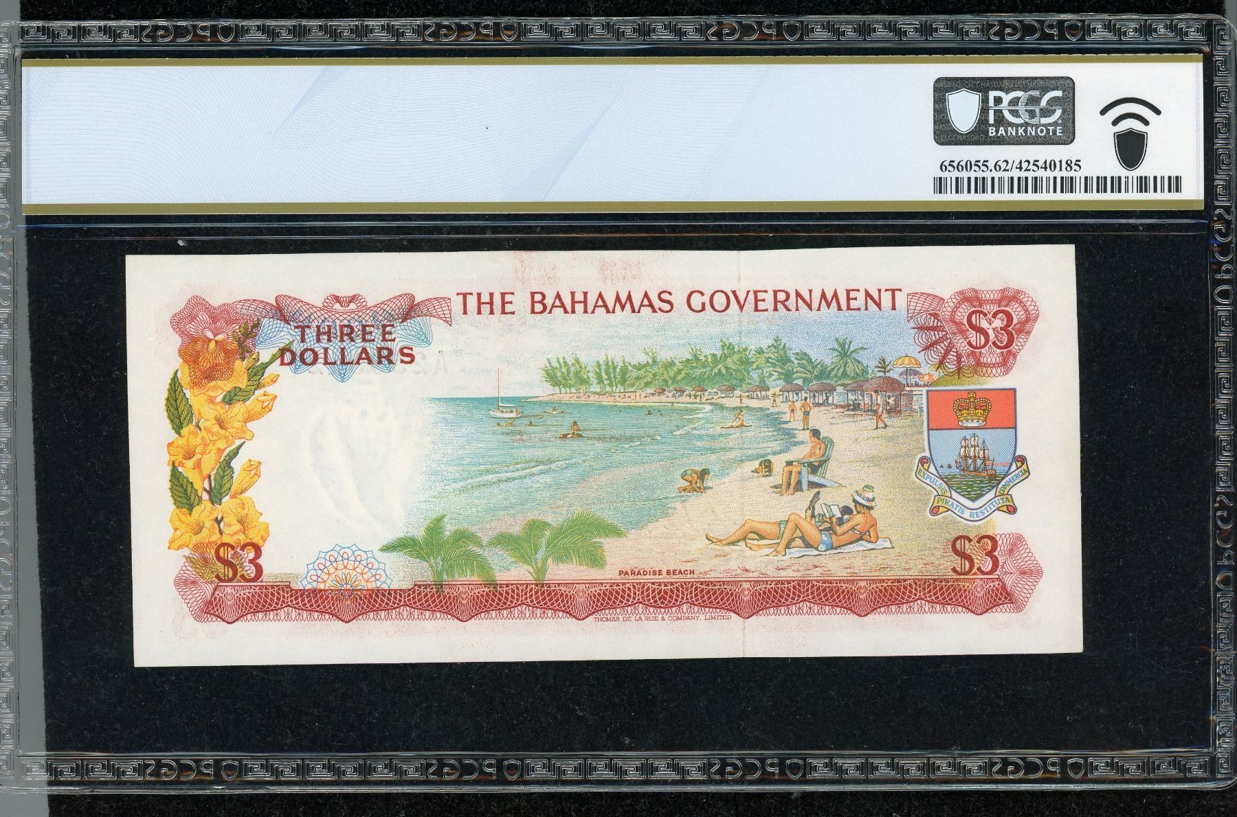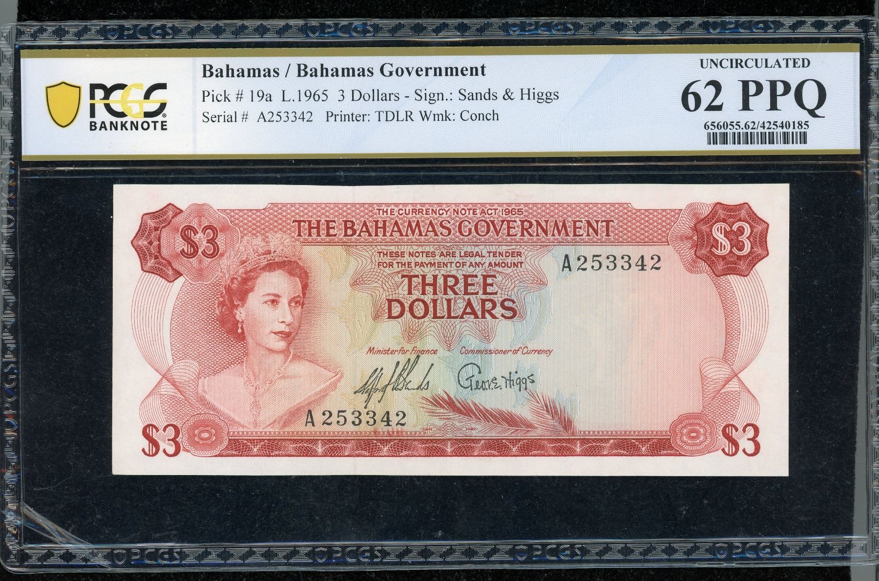 Bahamas Three Dollars 1965 issue, P.19a, Sands & Higgs, S/N: A253342, PCGS MS-62.