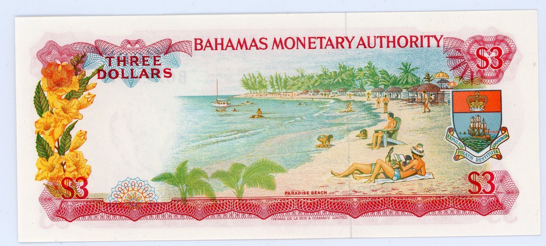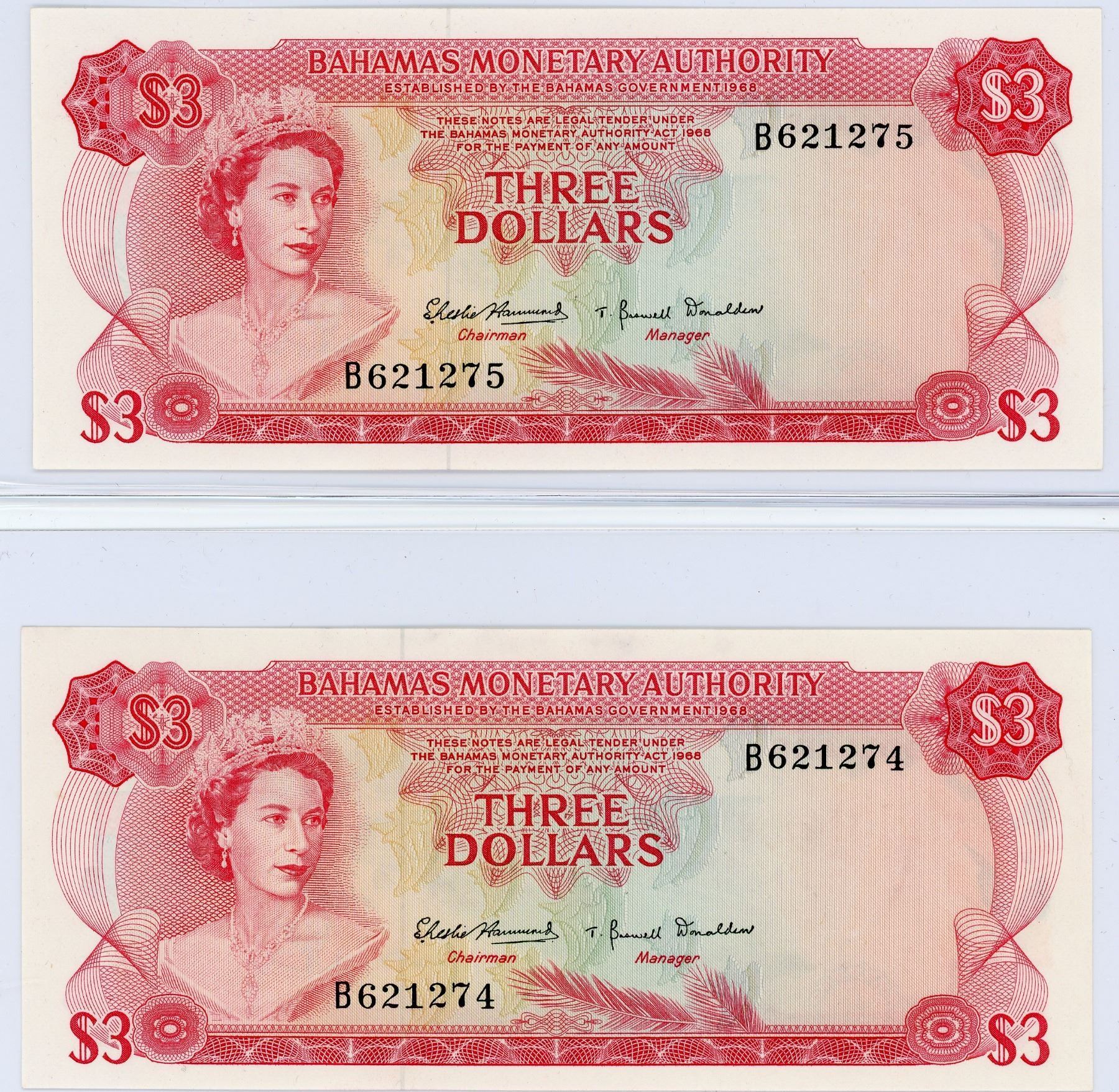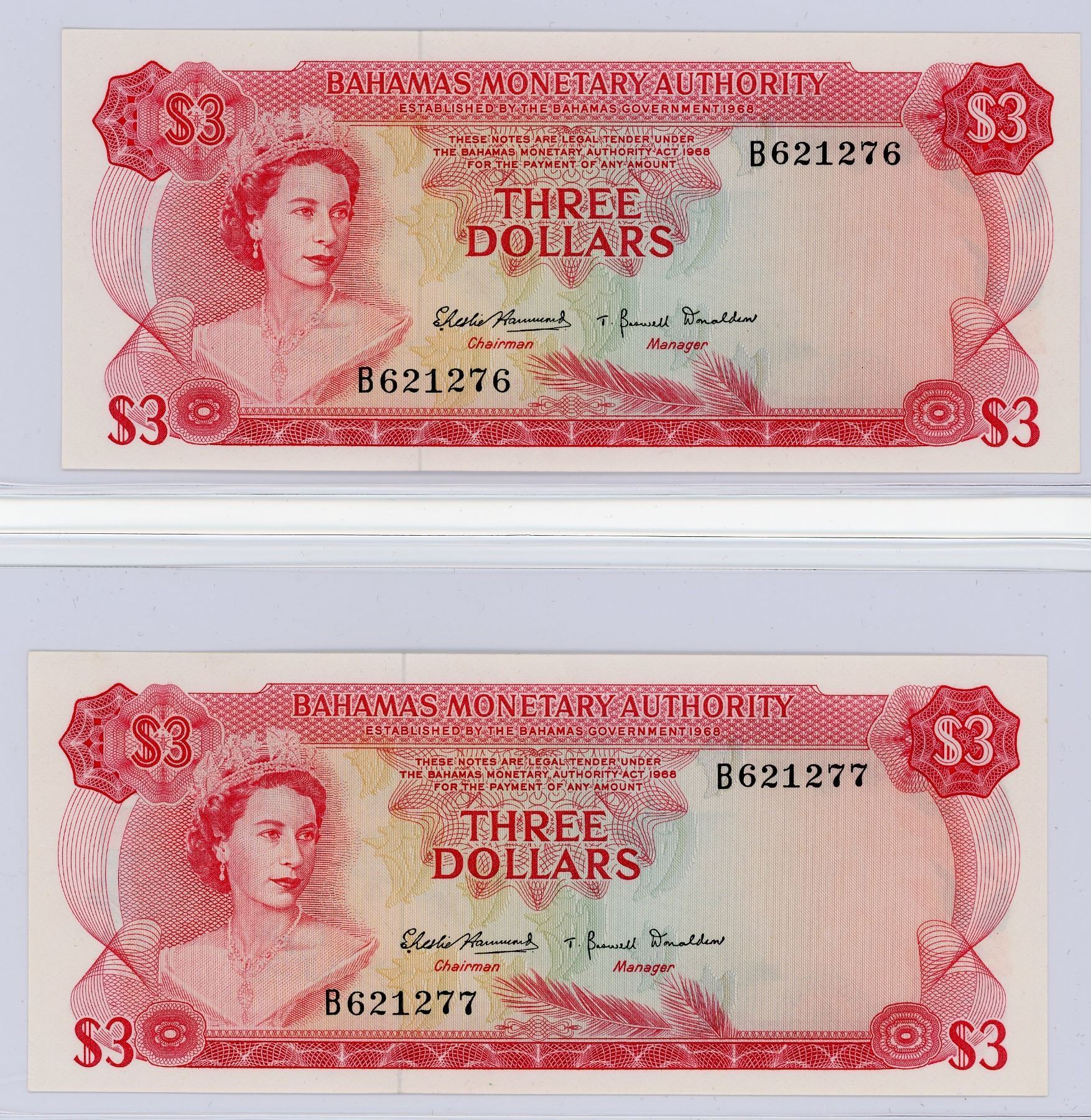 Bahamas Three Dollars 1968 issue, P.28a, a consecutive run of 4 notes, S/N: B621274-77, UNC (Lot of 4 notes)