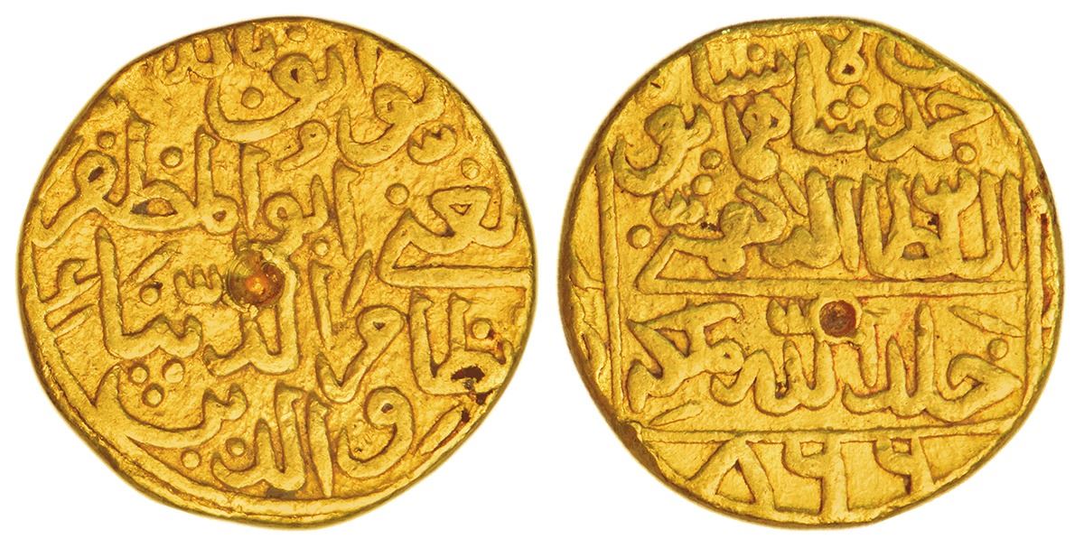 Bahmani Sultans of Gulbarga, Gold tanka of Nizam al-Din Ahmad Shah III (1461-1463AD), Hadrat Muhammadabad mint, AH 866, G&G BH102 (listed as RRR), 11.06g. Obv: Arabic legend al-wathiq billah al-ghani abu'l muzaffar nizam al-duniya wa'l din. Rev: Within a rectangular border, Arabic legend ahmad shah bin humayun shah(sic!) al-sultan al-bahmani khallada allah mulkahu followed by AH date in numbers below.