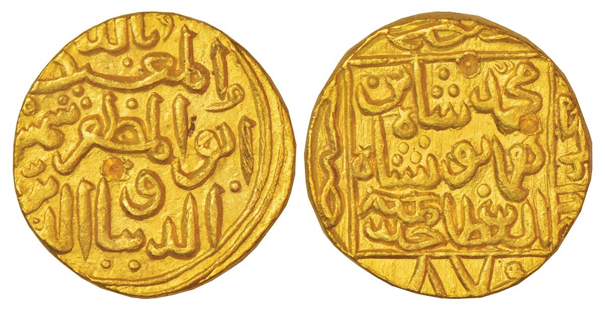 Bahmani Sultans of Gulbarga, Gold tanka of Shams al-Din Muhammad Shah III (1463-1482 AD), Hadrat Muhammadabad mint (fully visible), AH 870, G&G BH110, 11.06g. Obv: Arabic legend al-mu 'tasim billah abu'l Muzaffar Shams al-dunya wa'l din. Rev: Arabic legend muhammad shah bin humayun shah al-sultan khallada mulkahu in square, with date in numbers below.