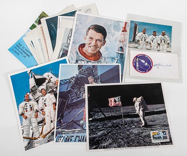 Balance of Consignment. Included are: Apollo 9 Cover Autographed by Jack Schweickart, an Alan Shepard early secretarial, Wally Schirra early autopen, and a nice assortment of 8 NASA photos (most color, some with red serial numbers). Photos show Ed White's spacewalk, Astronaut Group 5, Neil Armstrong LM training photos and more.