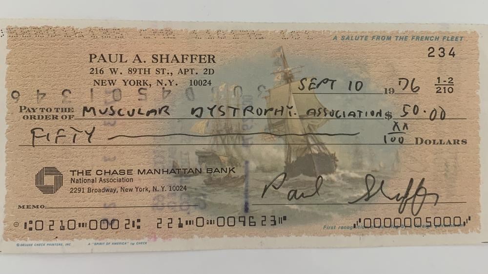 Paul Shaffer personal check $50 donation to Muscular dystrophy Association in 1976
