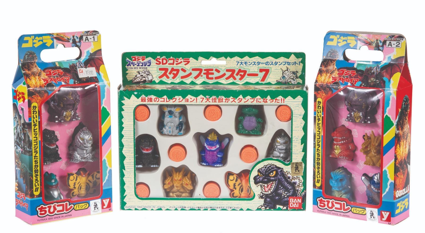 1994-95. Bandai Super Deformed Godzilla stamp pad set/Yutaka Super Deformed Godzilla Vinyl Figure sets A-1 & A-2. . VG+ Very slight wear on boxes.