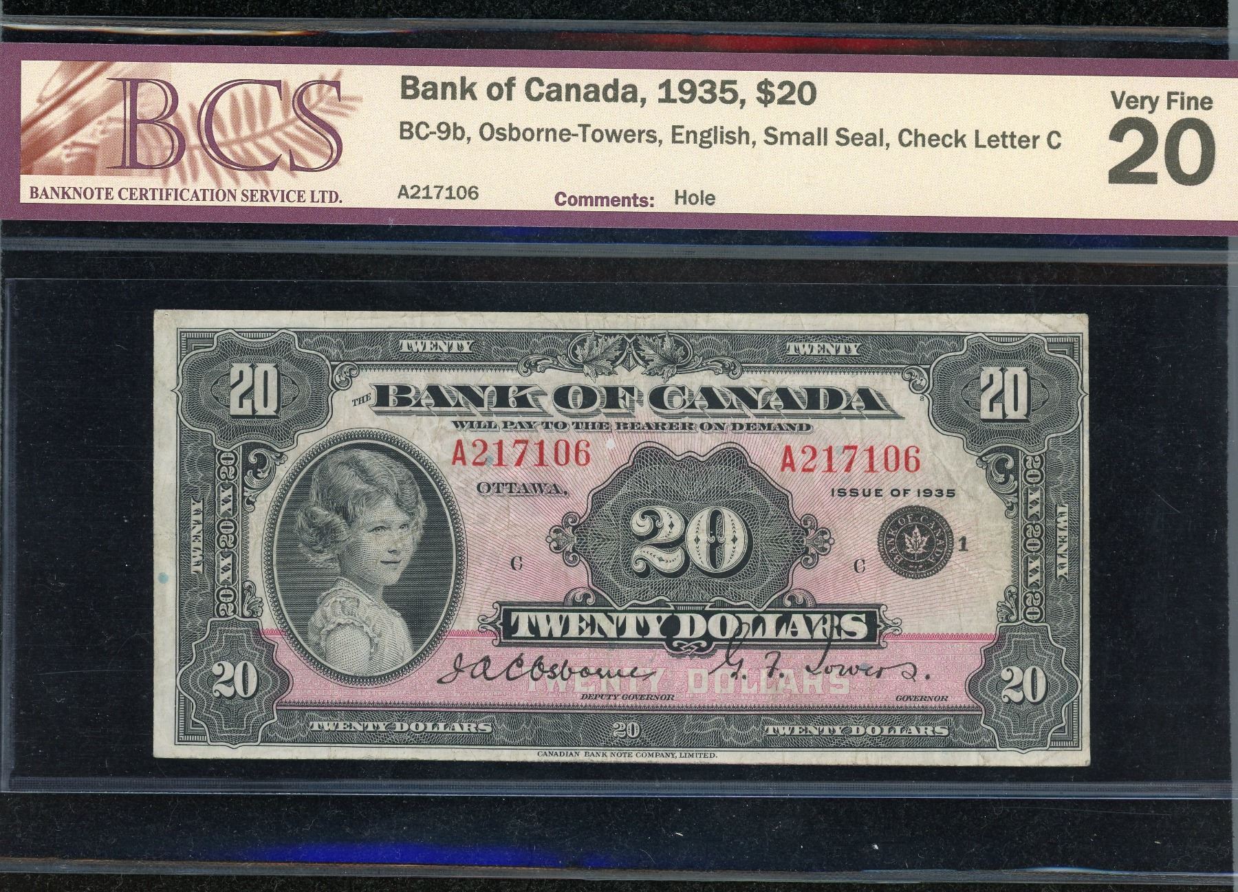 BC-9b, English, Small Seal, BCS VF-20, Hole. S/N: A217106. An attractive note - we have difficulty locating referenced hole, and conclude it to be extremely subtle
