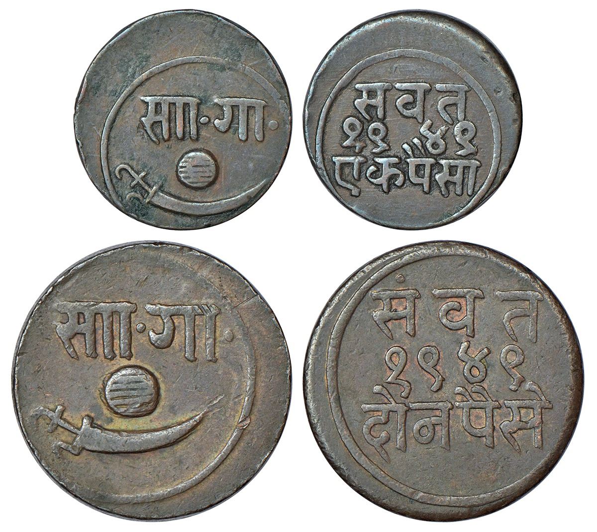 Baroda, Sayaji Rao III (1875-1938 AD), Machine struck, copper coins (2), 1x paisa, 7.54g, KM 24a and 1x 2 paisa, 15.72g, KM 25a, VS 1949. Obv: Devanagari 'Sa Ga' and scimitar. Rev: Date and denomination.
