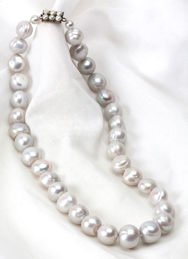 Baroque Pearl Necklace. Featuring baroque pearls measuring from 14.50 to 12.00 mm with 2 5.50 mm cultured pearls and completed by a pearl, 10k clasp, measuring 18 inches in length. Note: a few of the pearls have been drilled on one side.