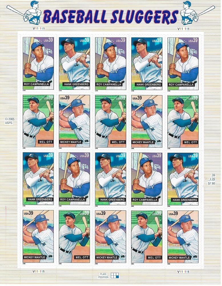Baseball Sluggers, Pane of 20 x 39¢ US Postage Stamps