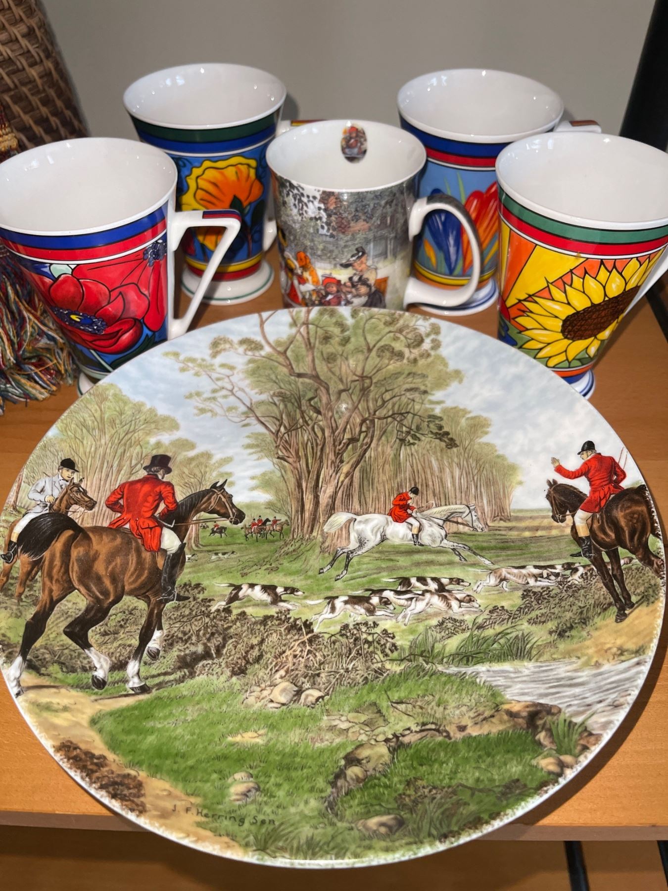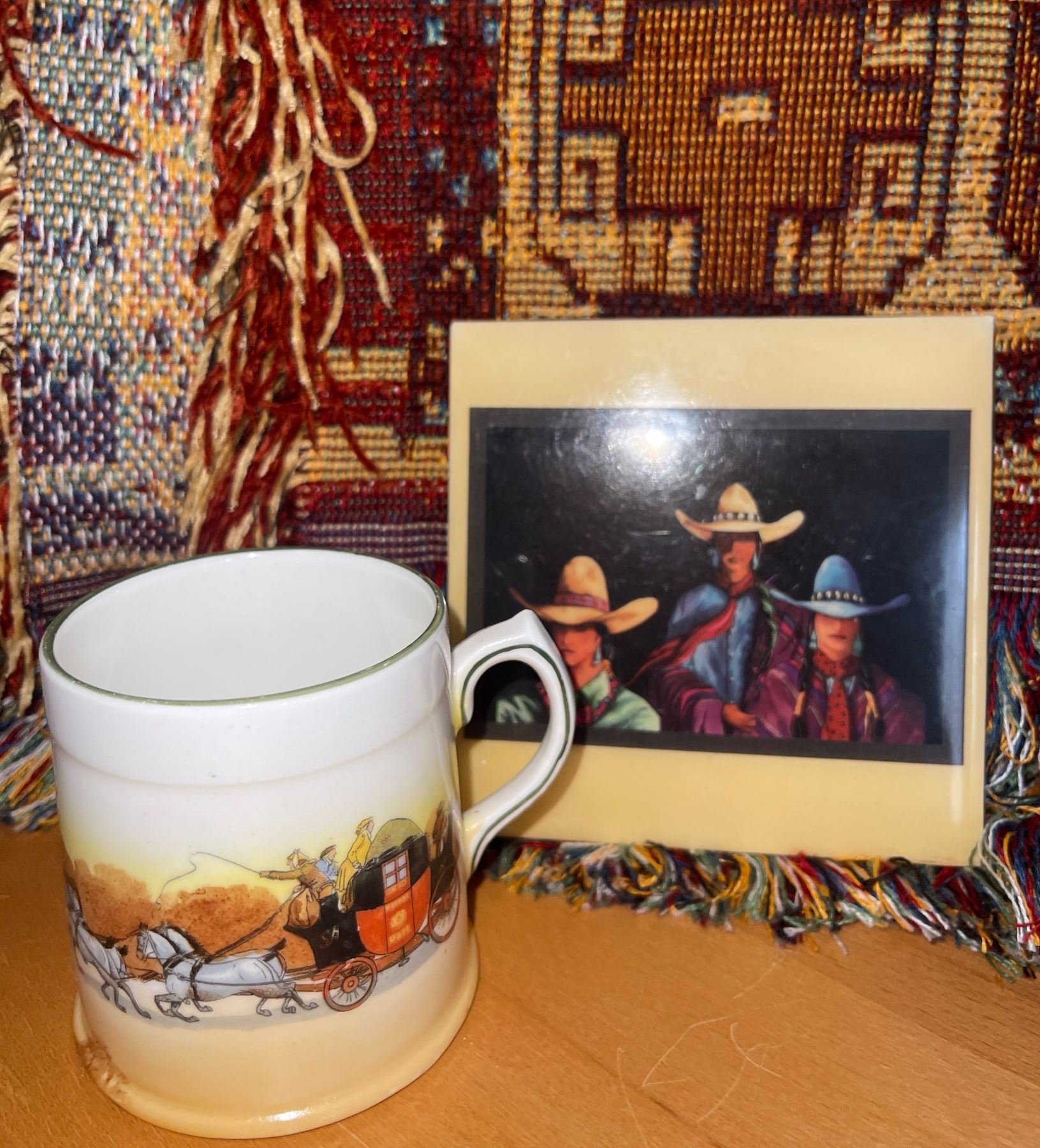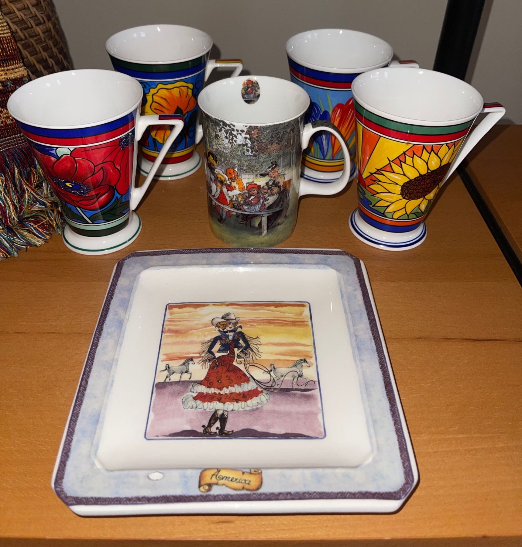 Basket & Handmade Throw Blanket W/Hat and Different Styles Of Coffee Cups