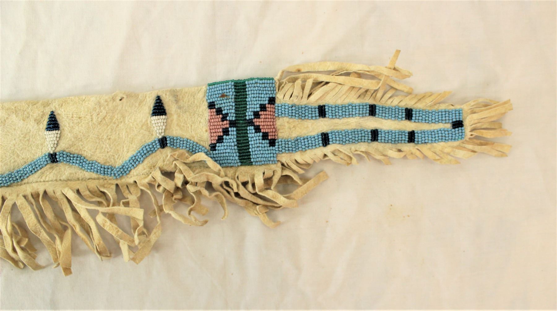 Out of the ordinary turn of the Century Plains Indian tanned hide pipe stem bag with attractive beadwork design and full perimeter fringe, measuring 3" x 36".
