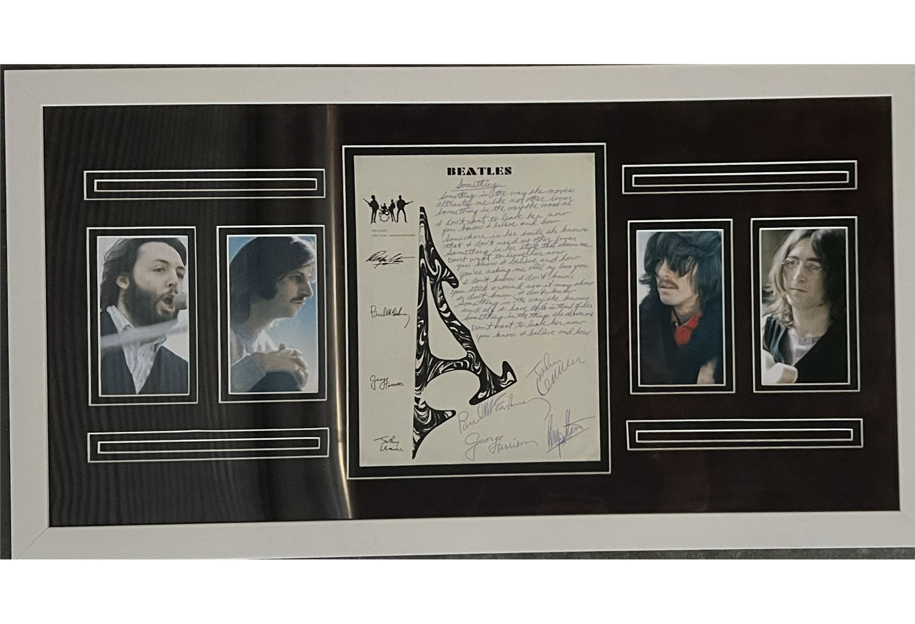 Beatles signed Something lyrics collage autographed by John Lennon, Paul McCartney, George Harrison and Ringo Starr. GFA authenticated. 17x32 inches