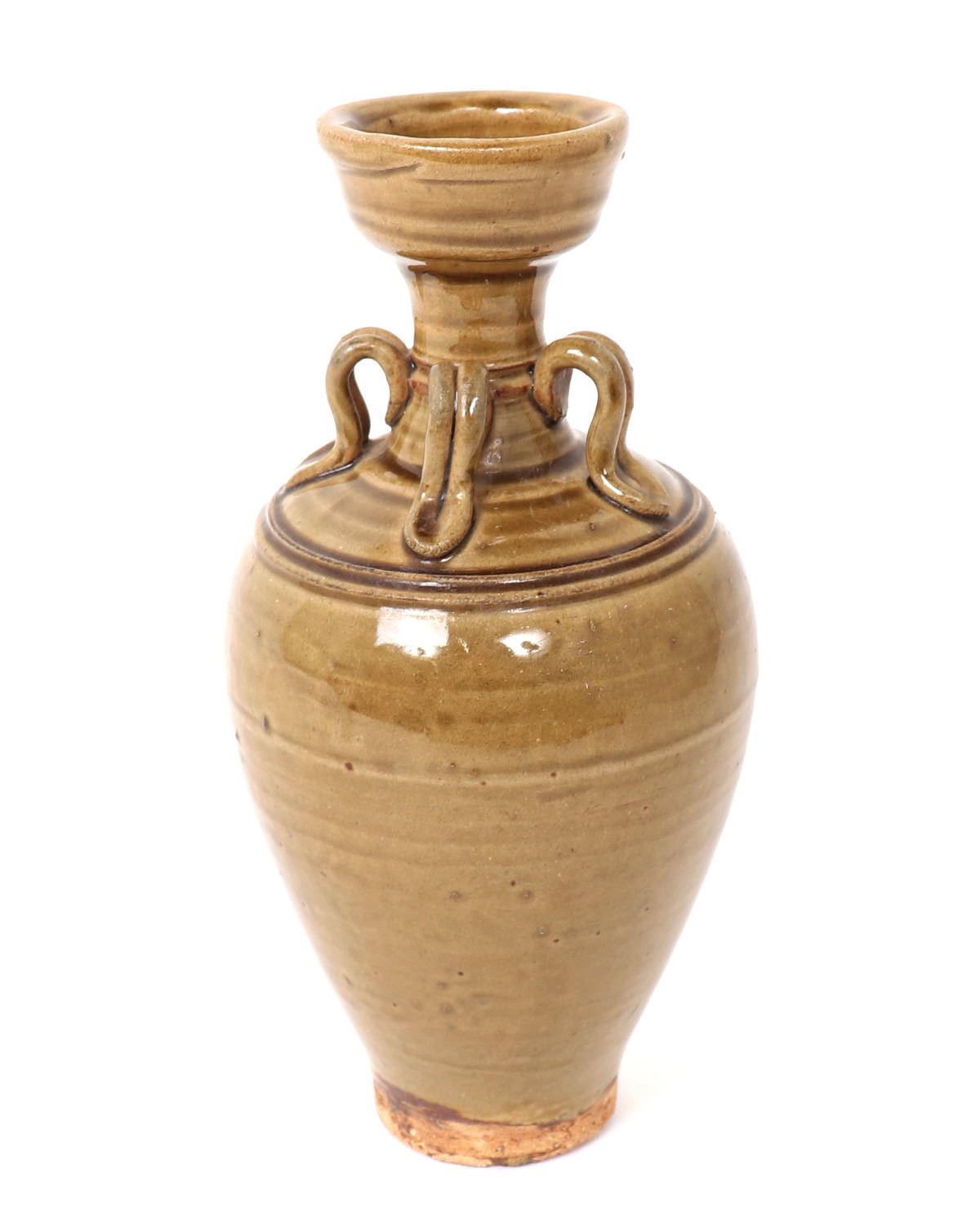 Lovely yellow glazed amphora shaped Korean porcelain vase. Four double banded arched suspension handles around the neck with incised banding to the shoulder, narrow corseted neck with wide flared rim and tall unglazed foot. Size 9 1/2" H. Condition: Overall very good condition with no obvious signs of restorations or repairs.