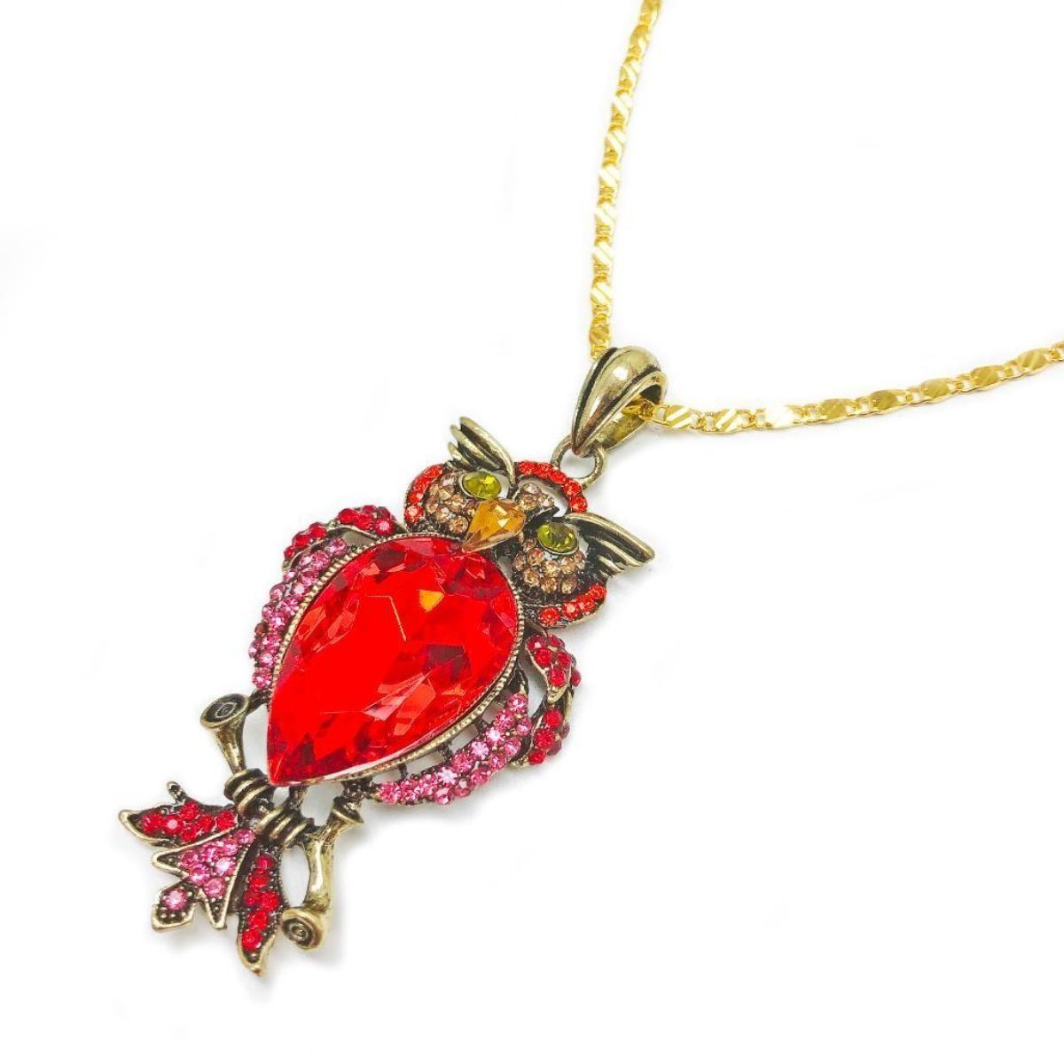 Bejeweled Red Rhinestone Enchanted Owl Pendant Paired With Marked Necklace 18KGP. View Photos For Further Details.