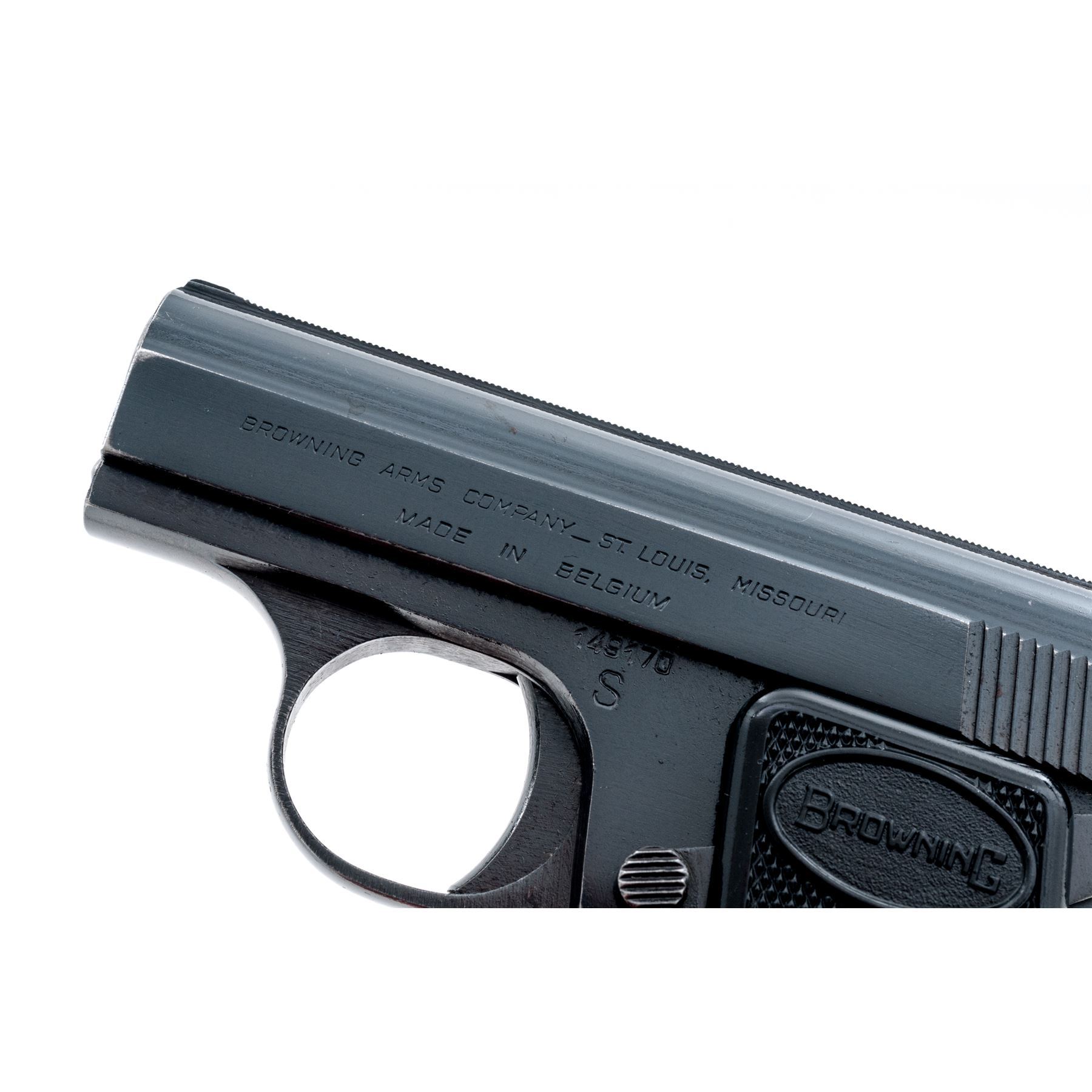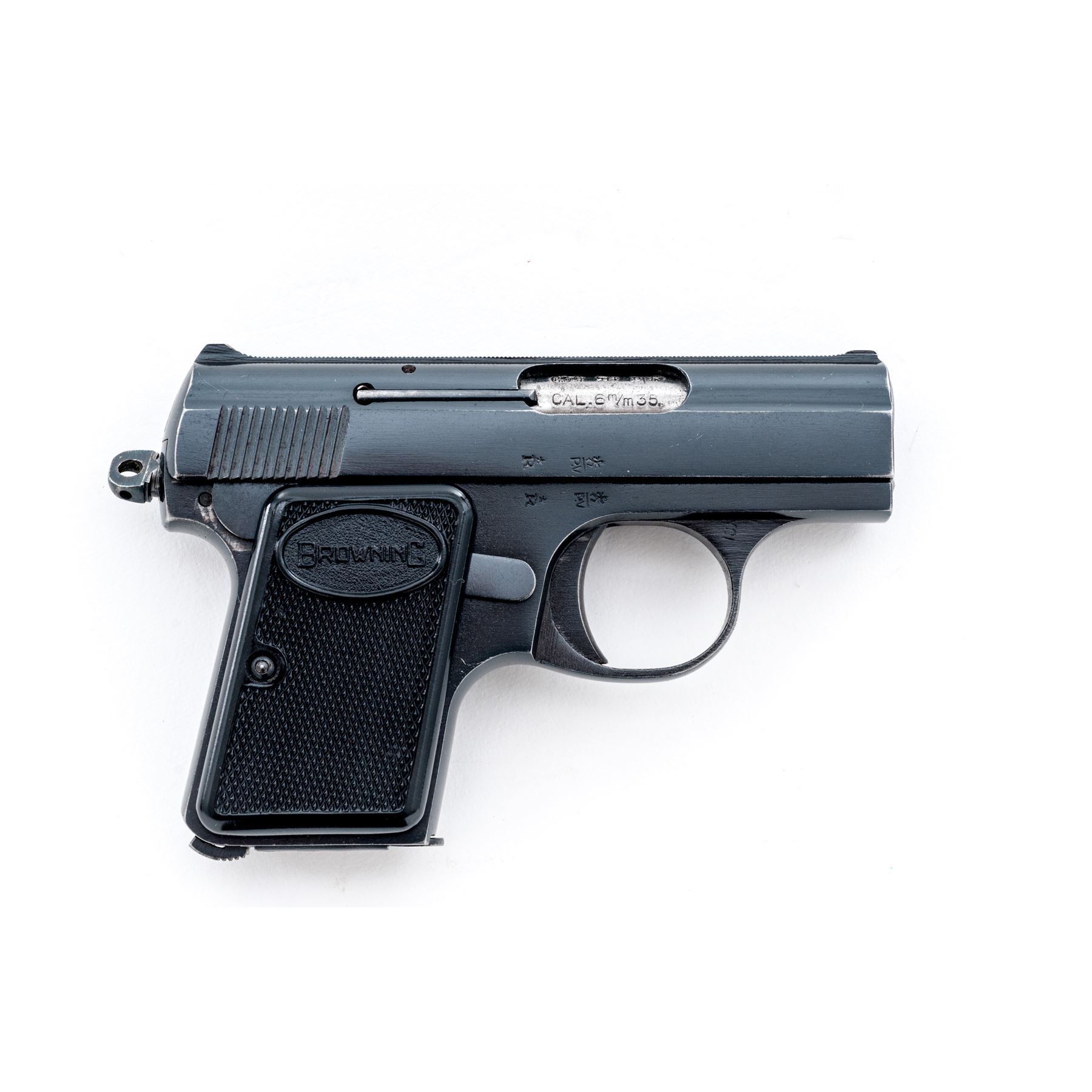 Belgian Baby Browning Semi-Automatic Pistol, #149170, .25 ACP cal., 2'' barrel, blue finish, checkered plastic Browning grips, with one correct magazine, and added lanyard loop to frame just below firing pin. Condition is excellent retaining approx. 97% lightly thinning blue. Grips and action are excellent, bore is mirror bright. Est.: $300-$500. (C&R/PPT)