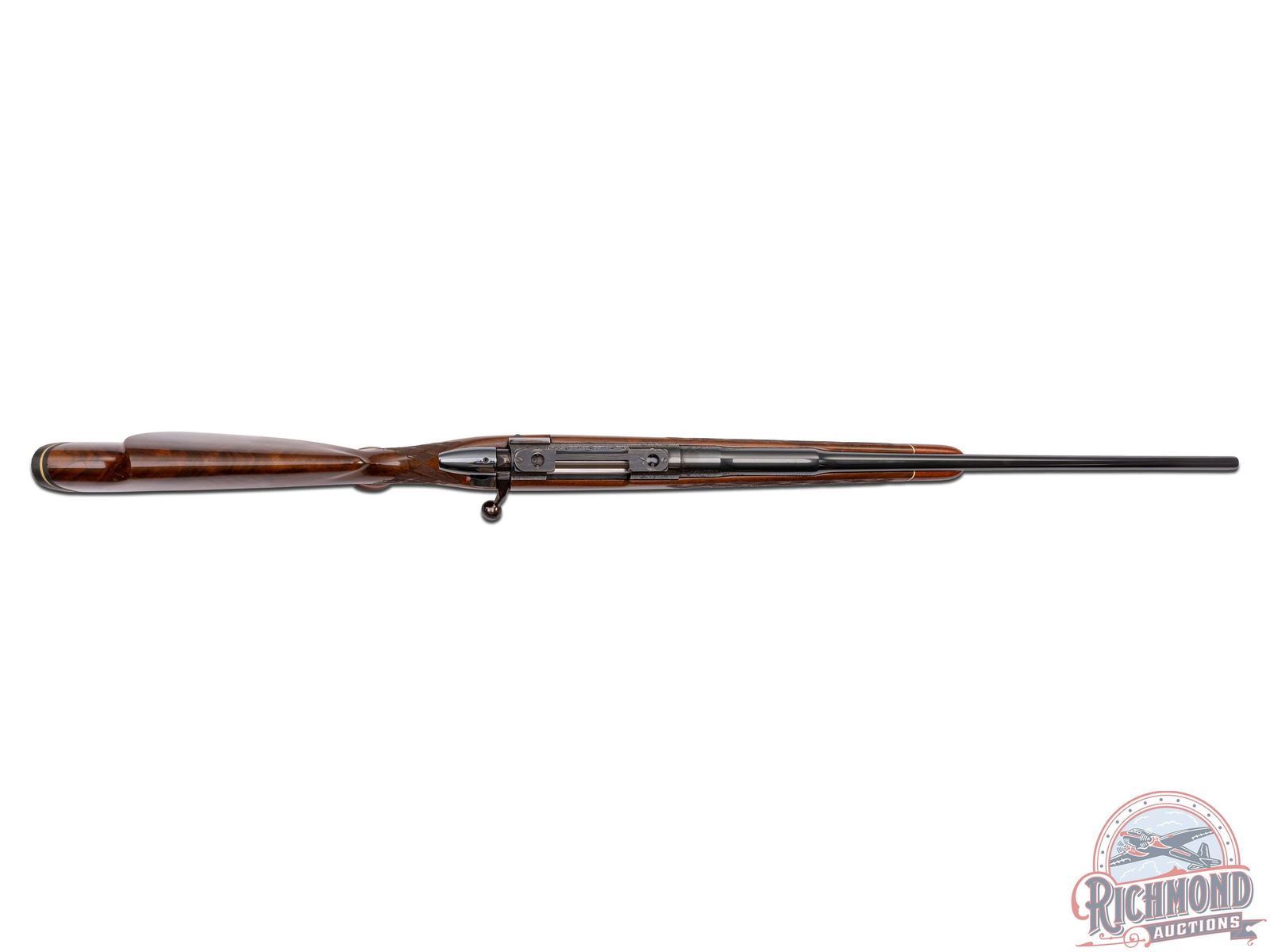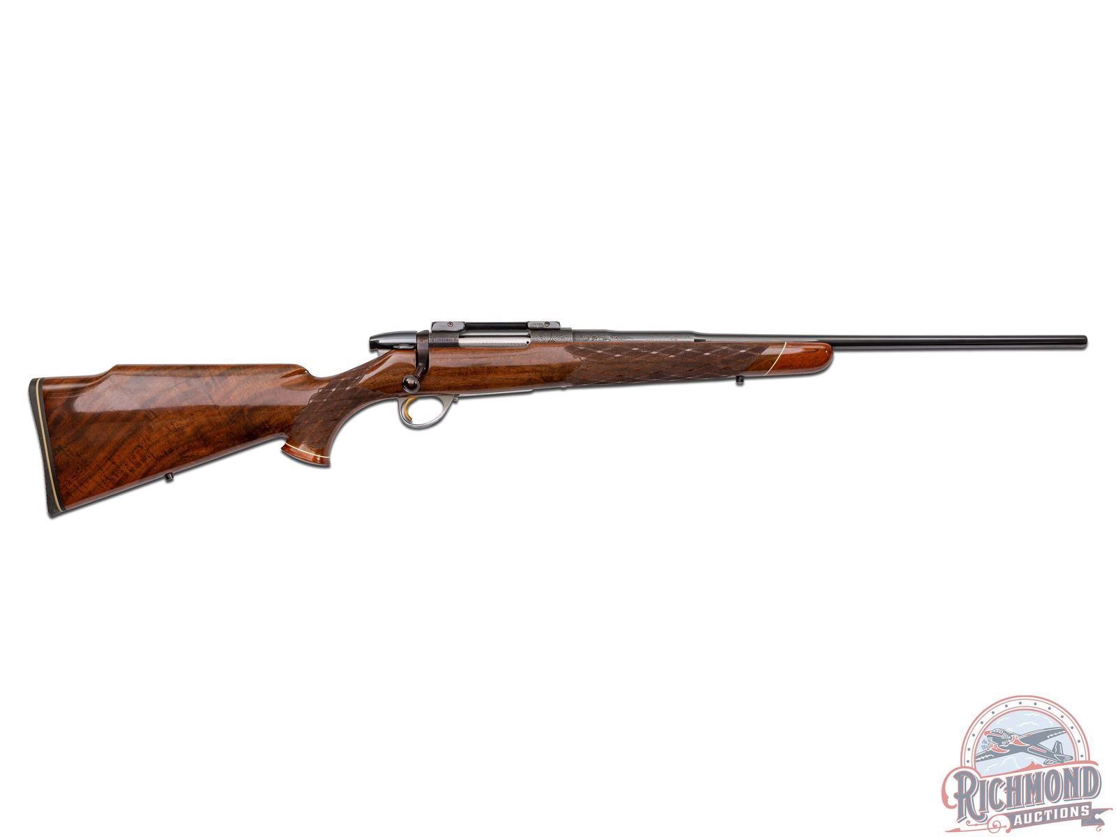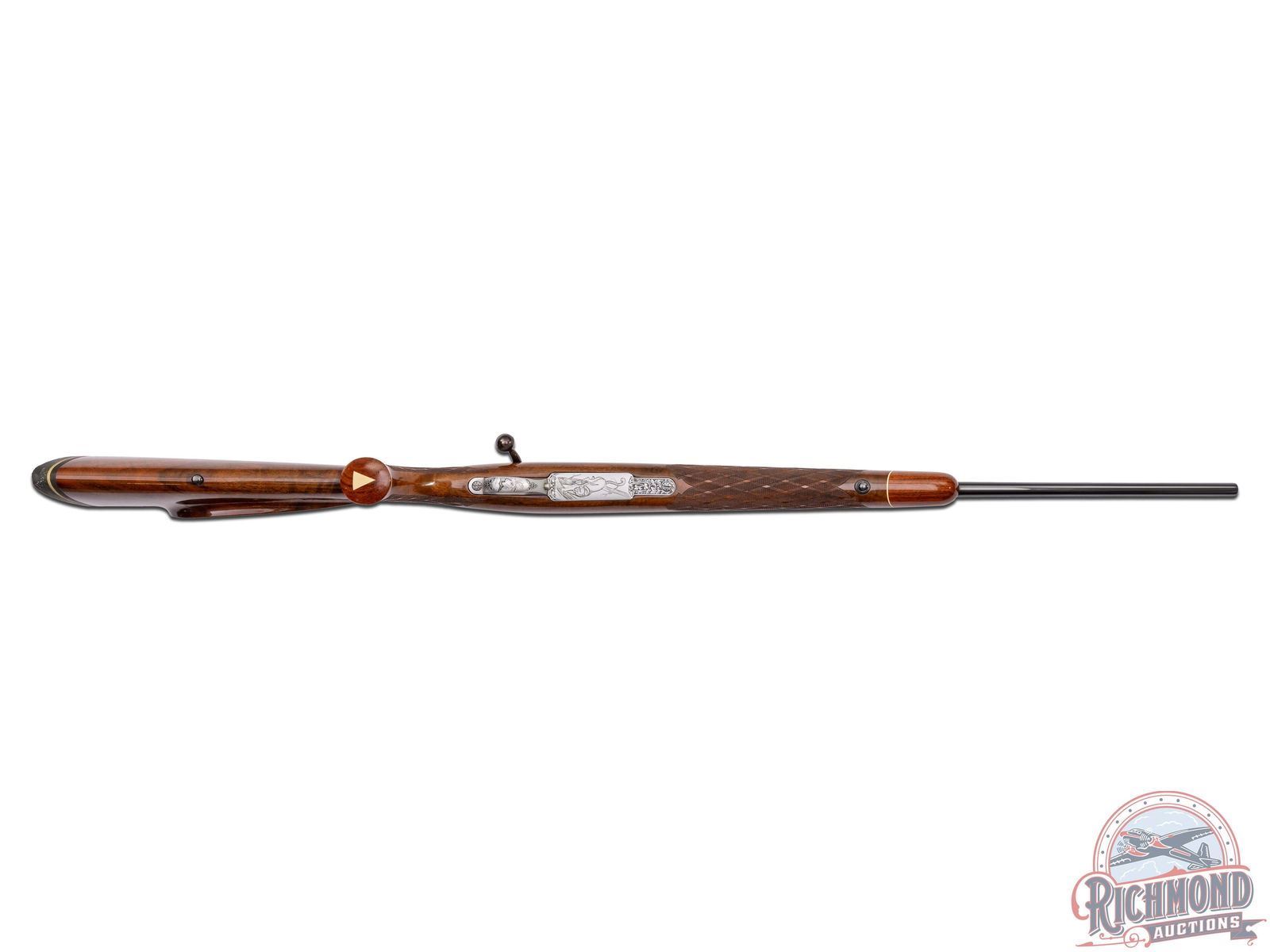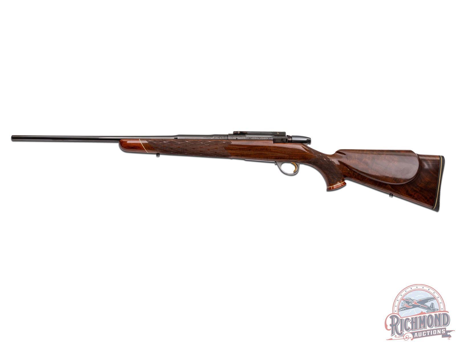 Made in Belgium by Browning in 1969. 22" blued tapered round sightless barrel in 243 Winchester caliber with Browning logo and floral engraved breech. Blued Sako action with floral engraving, gold washed trigger, satin finish detachable floorplate with Mountain Lion scene signed by "J. Lwanczk". Action is fitted with Conetrol one piece base. Figured walnut Monte Carlo stock with right hand cheekpiece with skip-line checkering and contrasting Rosewood grip cap and forearm. Stock is fitted with Pachmayr thin hard rubber 1/2" pad. LOP: 14". DAC: 1-1/4". DAH: 1-1/4". CALIBER: 243 Win. S/N: 12950Z69. FFL STATUS: Curio & Relic.