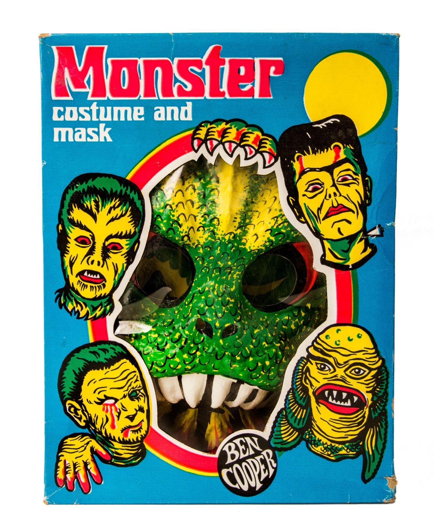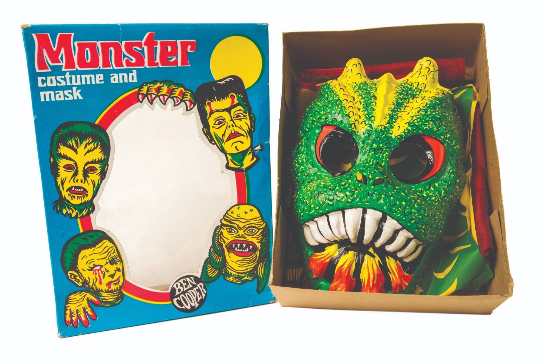 1978. Ben Cooper Large Child’s (12-14) Godzilla Costume w/ Box. Box: 11”x8. 5”x3. 5”. VG Costume has rip on lower left leg and light fading. Box has small tear lower right corner. Overall VG+