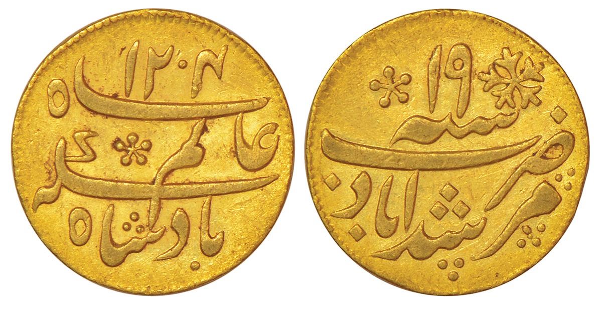 Bengal Presidency, Murshidabad, gold ¼ mohur, in the name of Shah Alam II, AH 1204/RY 19, edge gained right, Stevens EIC 4.7, 3.07g.