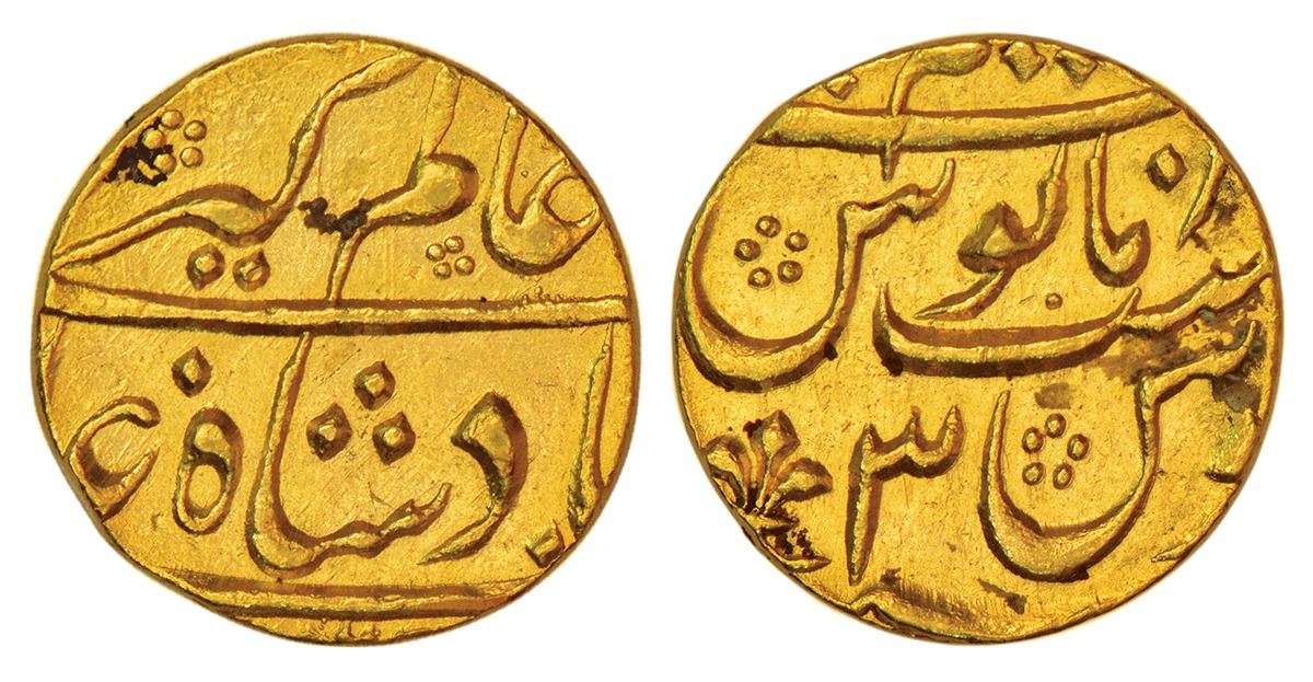 Bengal Presidency, Nawabs of Bengal, Nawab Siraj-ud-Daulah (1756-1757 AD), gold mohur, Azimabad (Patna) mint, RY 3, in the name of Alamgir II, trident mint-mark on reverse, 11.06g.