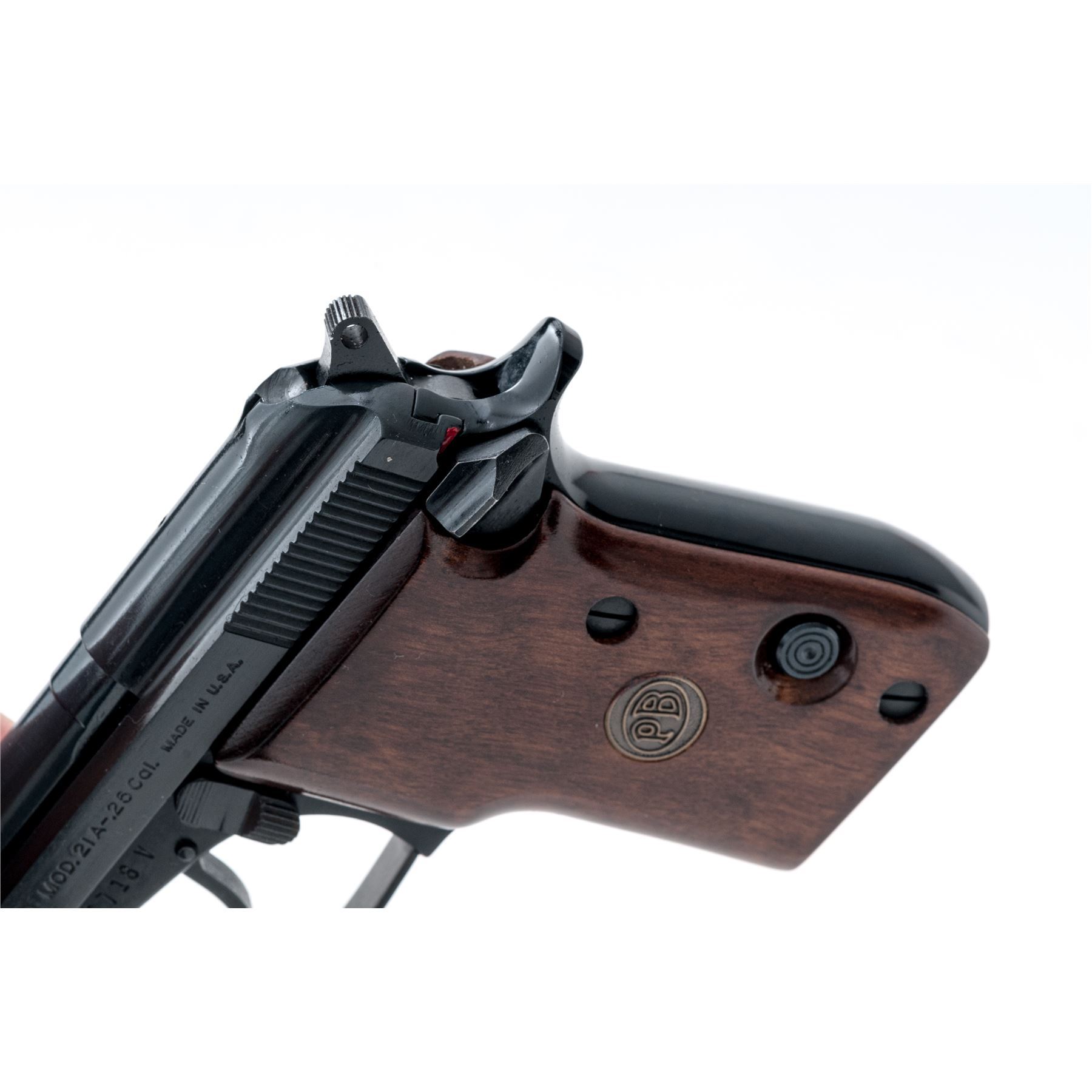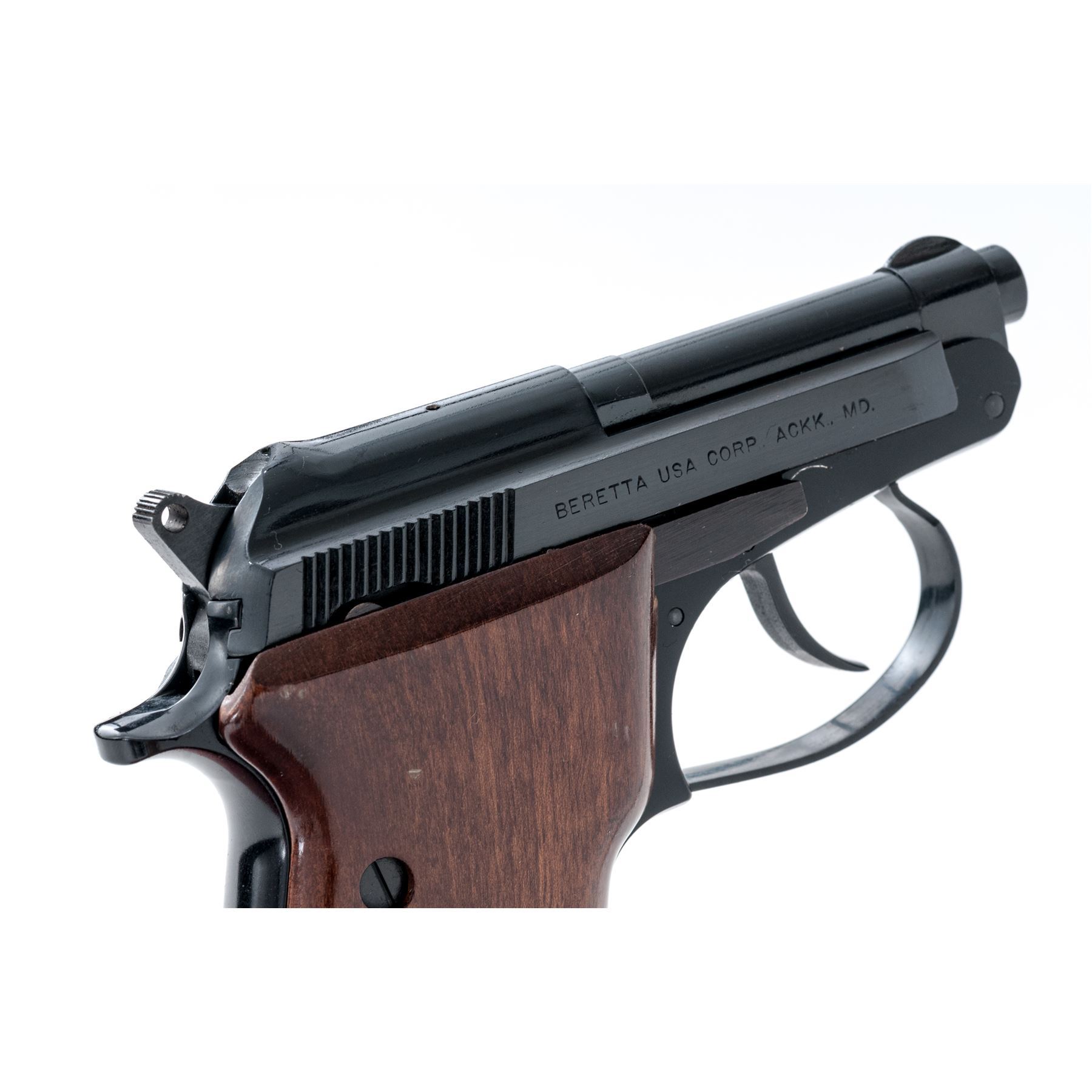Beretta Model 21A Semi-Automatic Pistol, #BAS19718V, .25 ACP cal., 2.5'' tip-up barrel, alloy frame, blue finish, smooth wood grips with Beretta medallions, standard fixed sights, with one magazine. In original box with matching end label, owner's manual, and cleaning brush. Condition is excellent with approx. 98%+ original blue finish. Grips with a few intermittent small marks from handling. Action and bore are both excellent. Box shows moderate storage type wear, end label is clear. Est.: $200-$300. (Modern/PPT) (Consecutive to the Previous Lot)