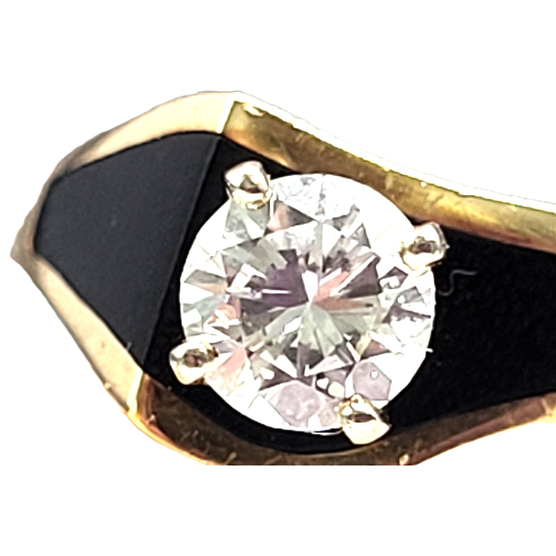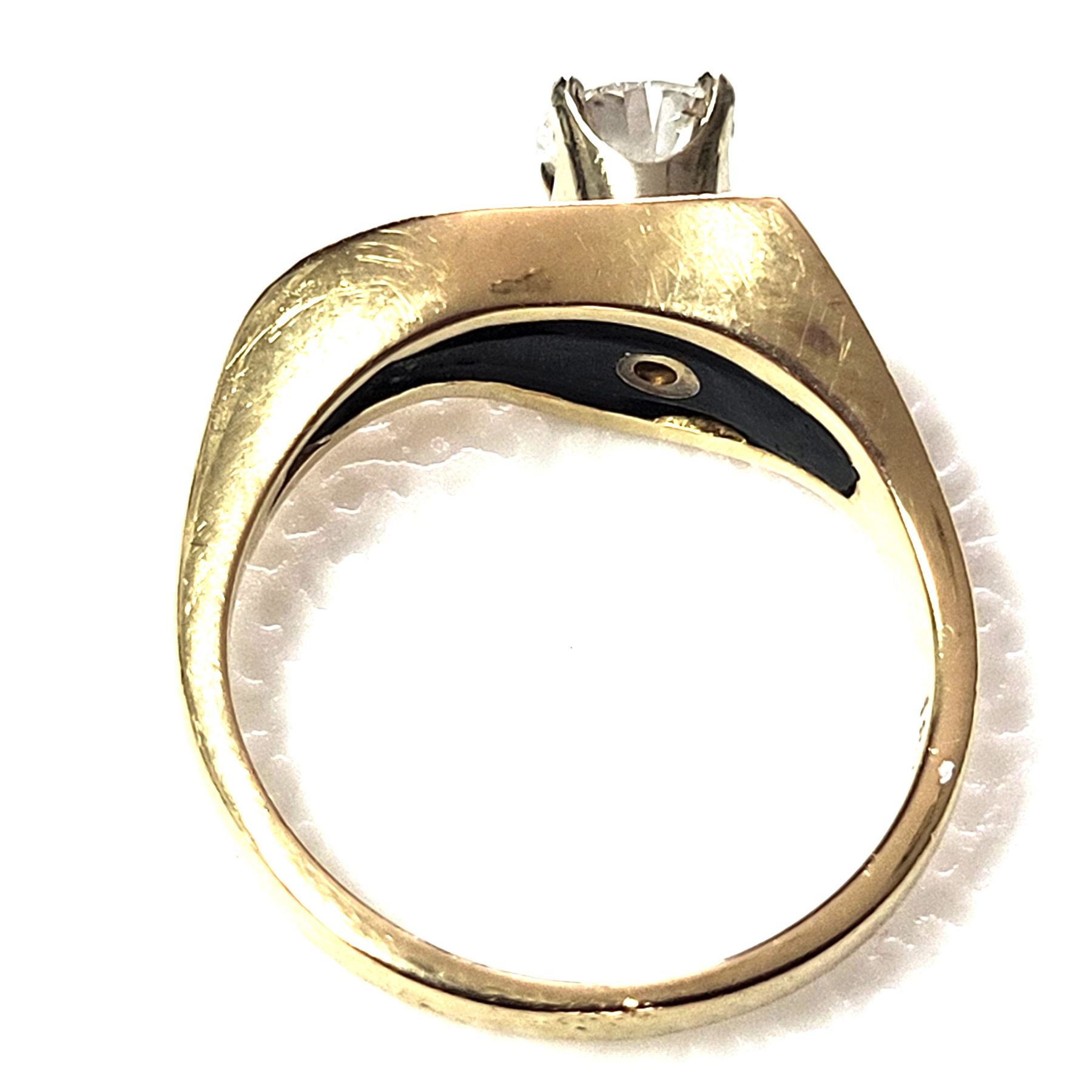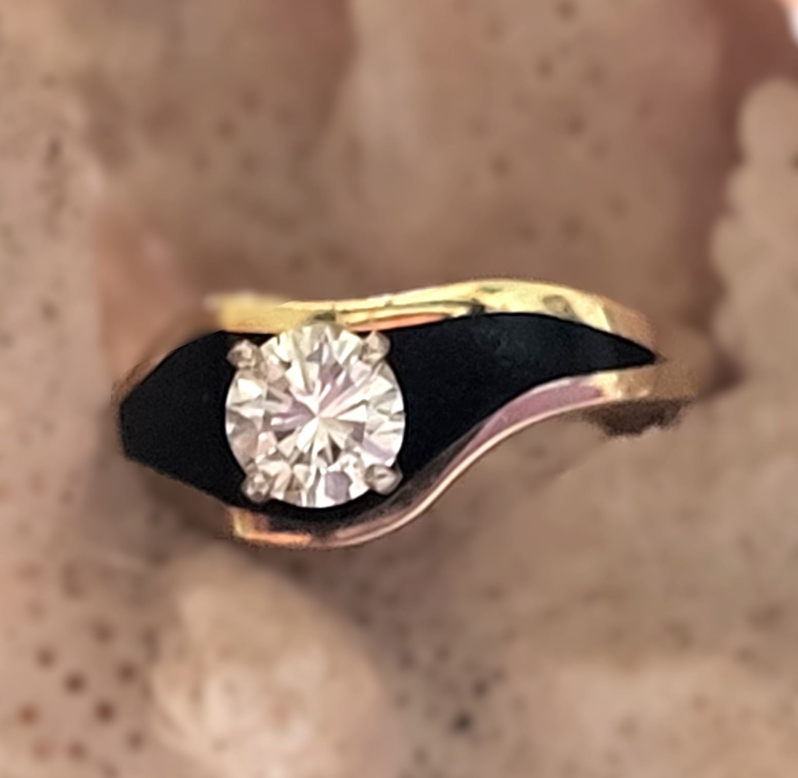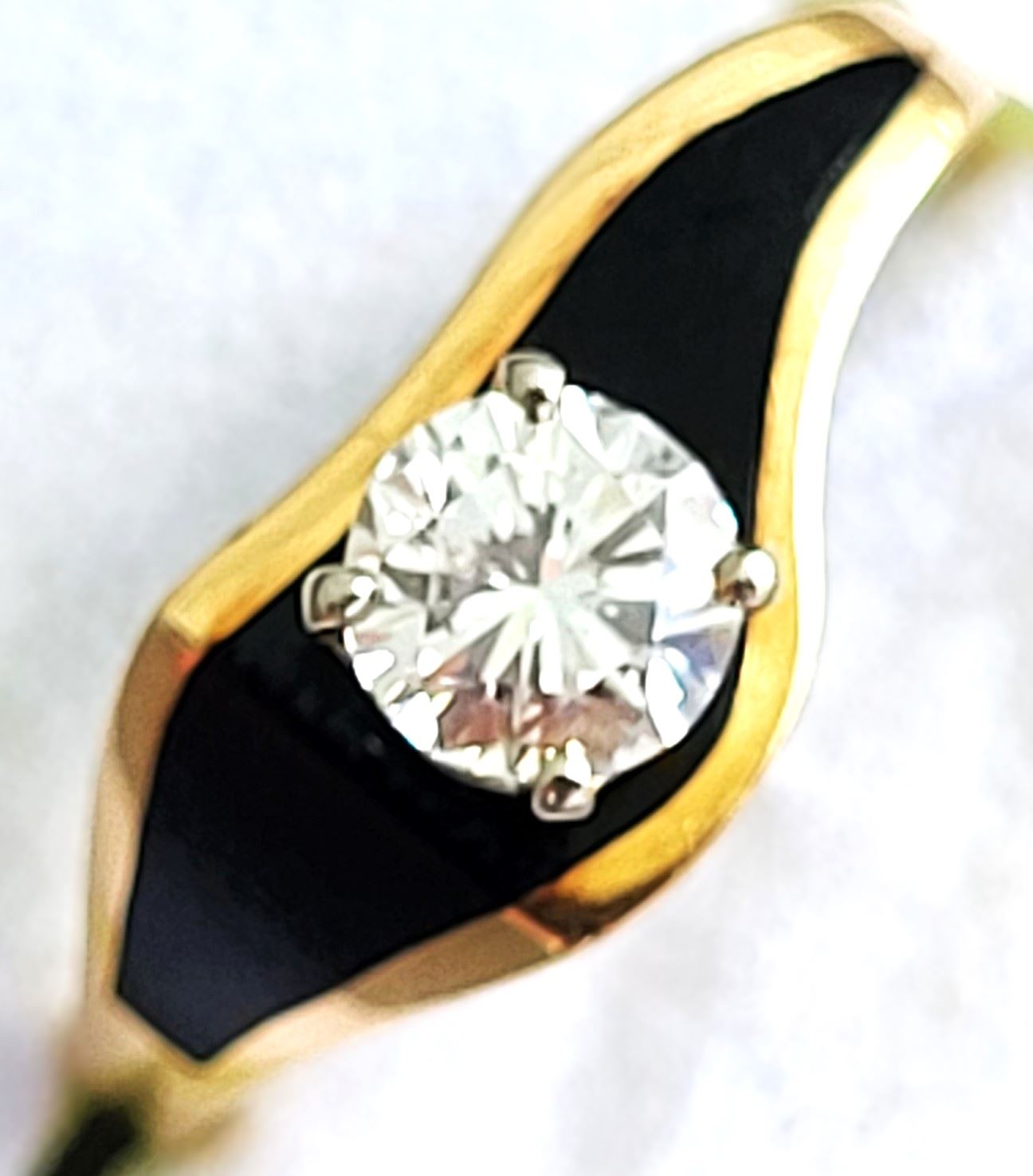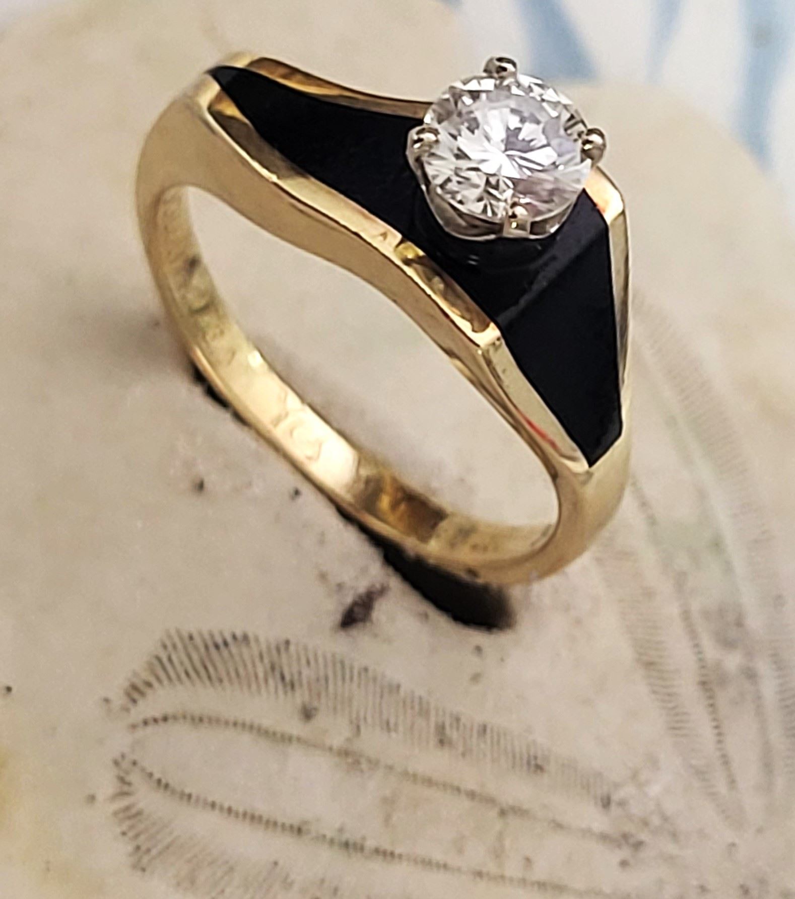 Designed by world-renowned, American sculptor, Bernard K Passman (1929-2007), this 18 karat yellow gold ring is set with sculpted black coral, the medium Mr. Passman is famous for using in his works, and a very exceptional quality earth-mined diamond.& nbsp; This signed Bernard K Passman creation is a ladies contoured engagement ring with inlaid black coral that is sculpted to follow the alluring curves, before sharply plunging down the diamond-bearing shoulder that tapers to an approximate 2.25mm ring shank. For this ring, Mr. Passman chose to set a top-quality, earth-mined diamond. This solitaire diamond is approximately one half carat (.50 ct) round, brilliant-cut, G color, VVS1 clarity is secured in a 14 karat white gold head with four prongs and a sturdy basket.& nbsp; As in almost all of Mr. Passman's jewelry designs, the initials & quot;BKP& quot; are hand-etched, most likely with a hand-held rotary tool, approximately 1/3rd of the way down the outside shoulder opposite the diamond. This ring is US size 5.5 and is extremely limited to alterations, due to the nature of the black coral.& nbsp; Please inquire with Bidfair Fine Jewelry for sizing capabilities and associated charges. The provenance of this ring is located at the bottom of this page, along with a brief history of Mr. Passman's interesting life works.
