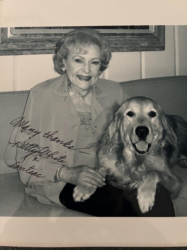 Betty White photo autographed by Betty White and her dog Pontiac. 8x10 inches