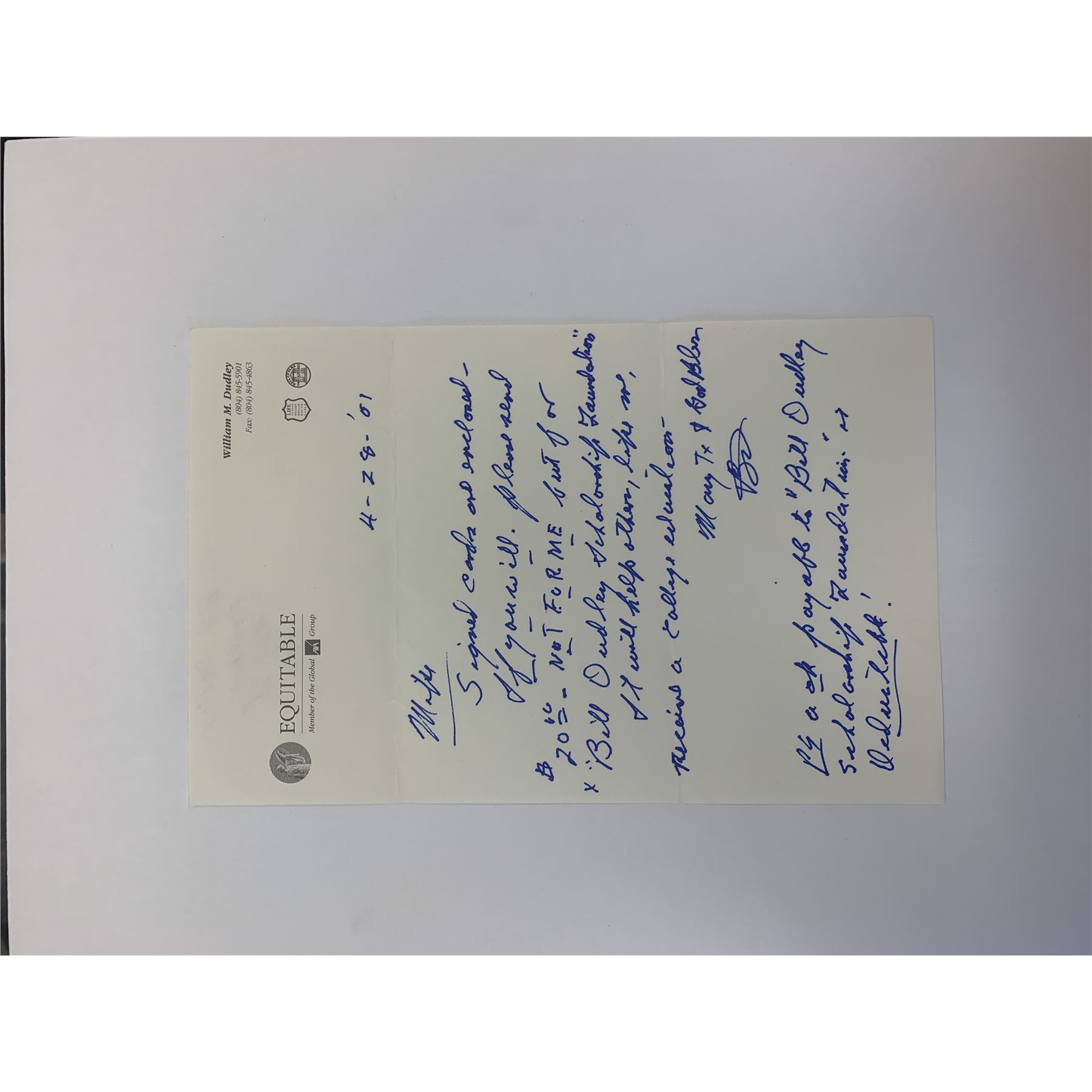 Handwritten and signed letter by Bill Dudley on his personal letterhead. 5x7 in.