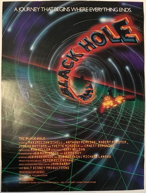 (Disney, c. 1979). Disney's "Black Hole" was released to theaters in 1979 and at the time was the most expensive movie ever made by Disney and the first to receive a PG rating. It's space disaster theme has stayed as a fan-favorite for several years. Offered here is an original 36" x 24" Black Hole movie poster in its original tube packaging. The outside of the tube has same wear and damage to it, but the poster itself is still housed inside. Though there are indents on the tubing that might have caused wrinkling or rippling to the poster itself. Item comes with a Grand Circle Tour Auctions COA.