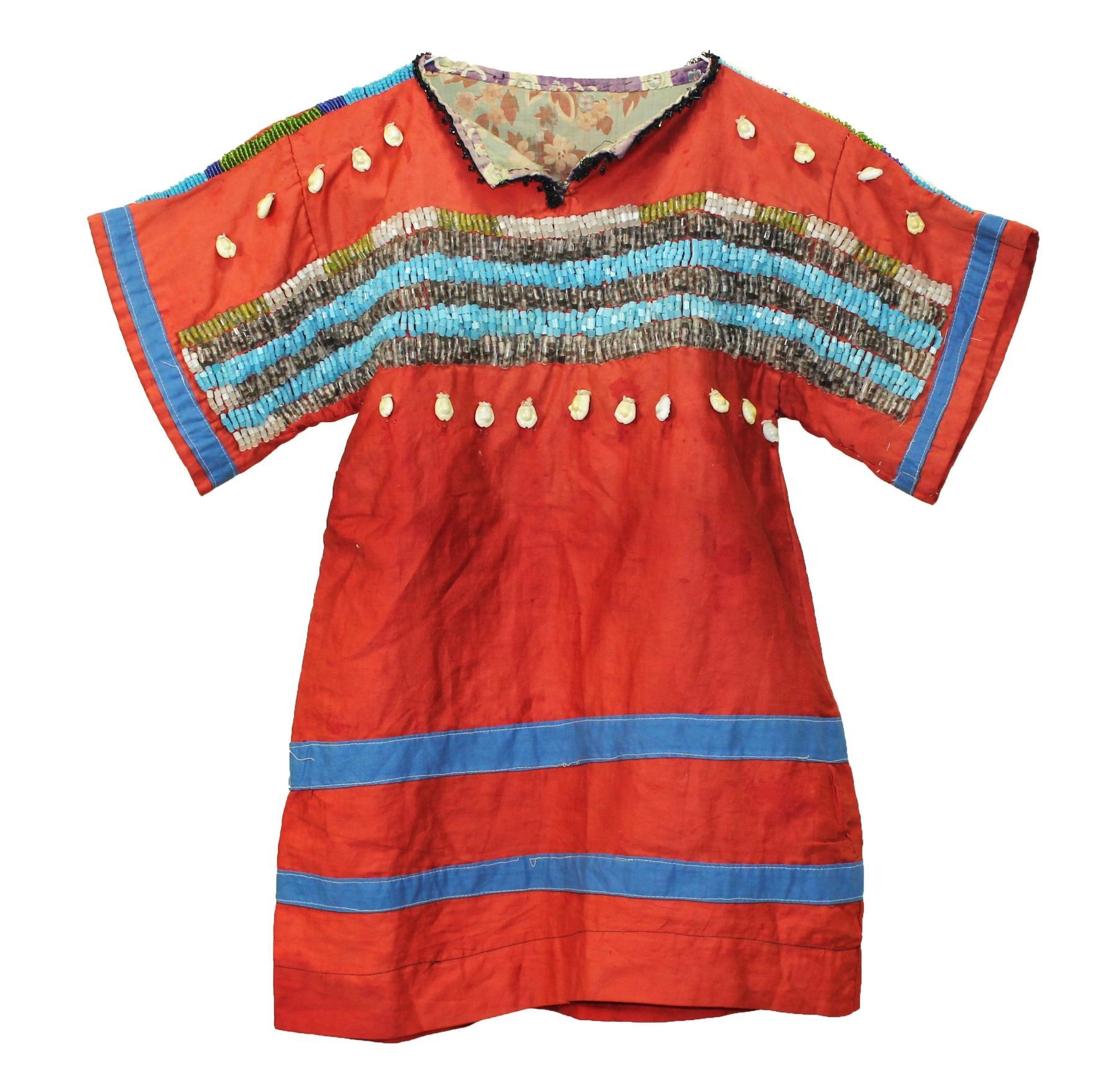 Nicely appealing Plains Indian cloth dress, beautifully decorated with cut glass beads and shells. In nice condition.