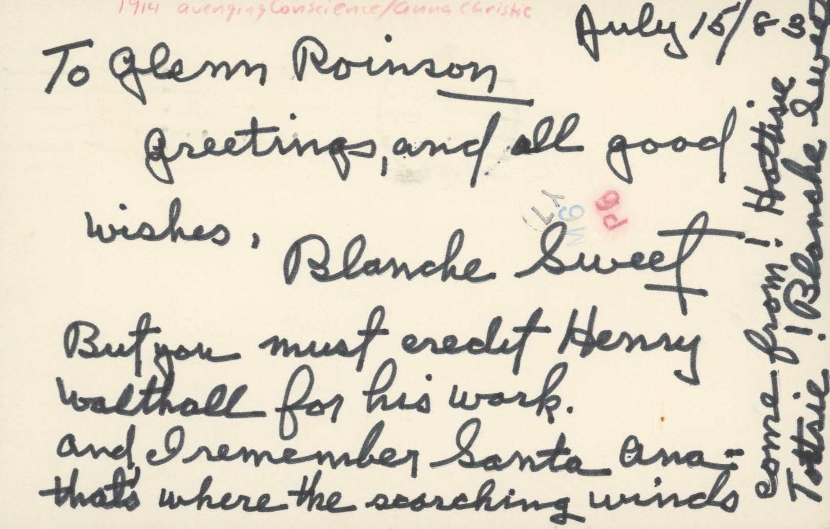 Blanche Sweet handwritten personal note dated July 15, 1983
