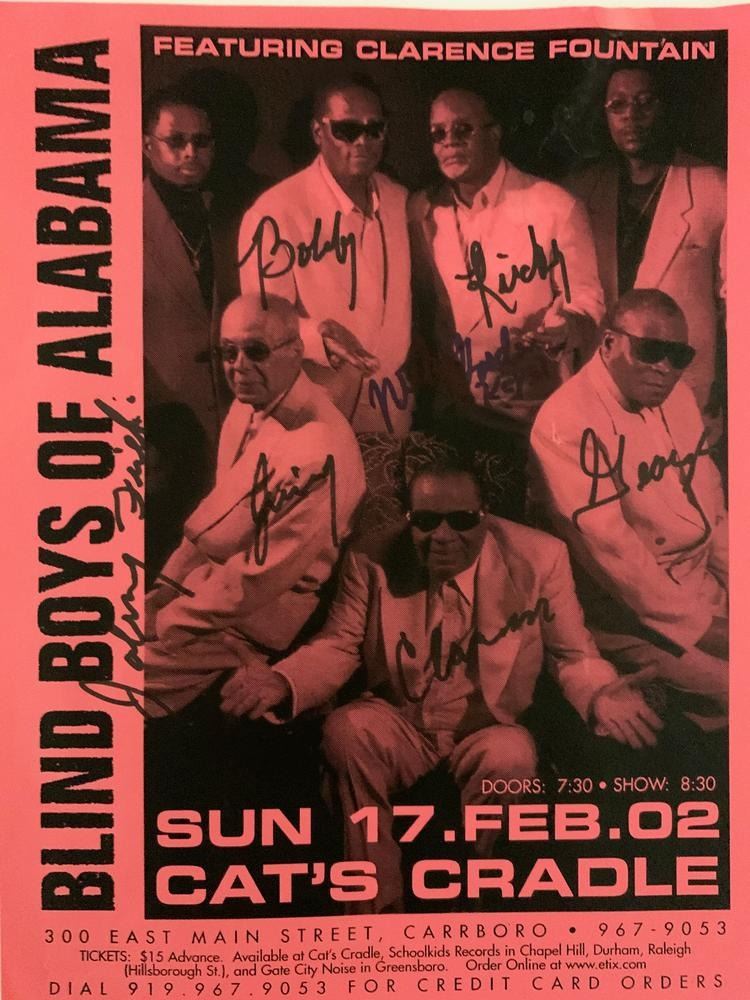Blind Boys of Alabama signed concert flyer autographed by Jimmy Carter, Clarence Fountain, Johnny Fields, George Scott, Ricky McKinnie, Ben Moore, and Roscoe Robinson.11x9 inches