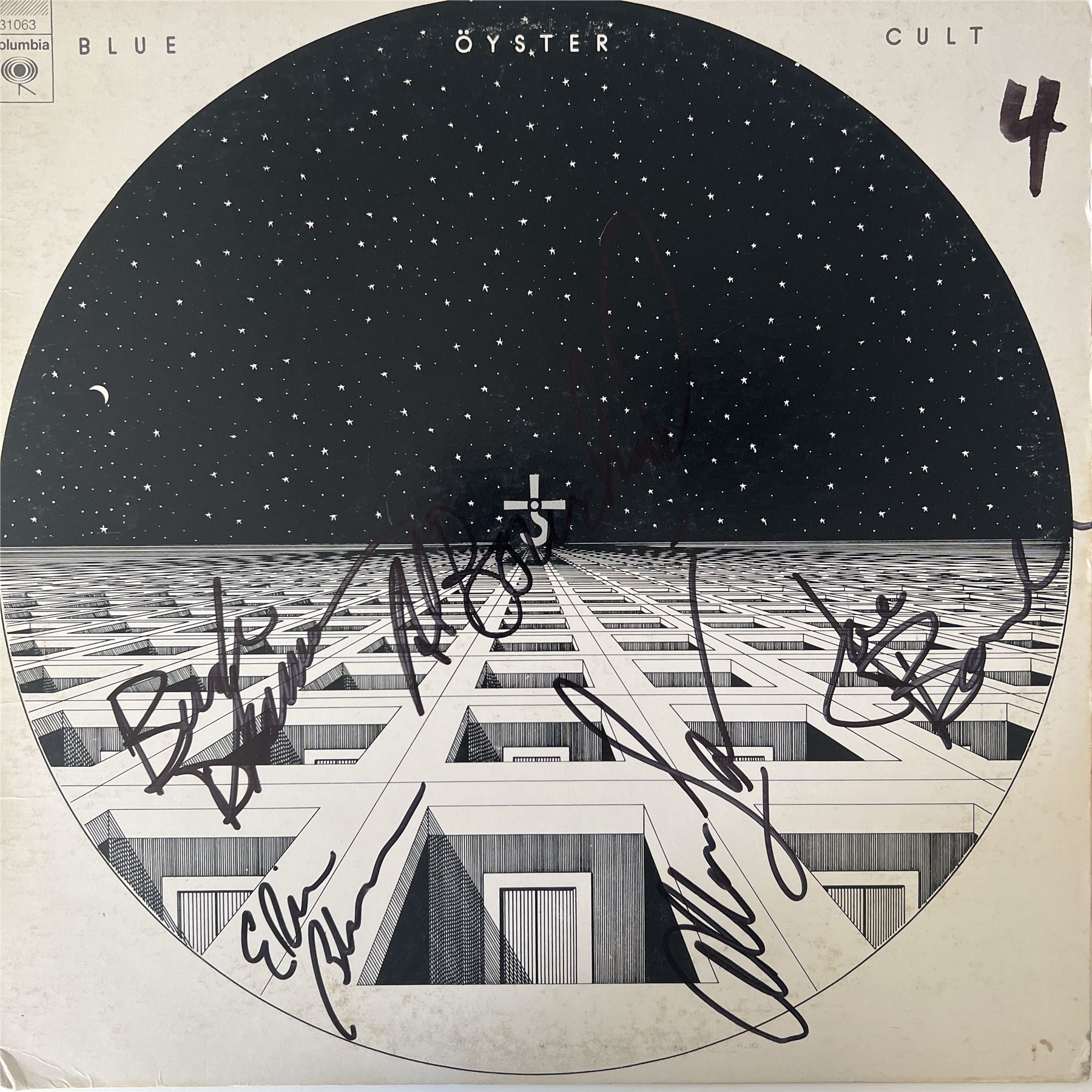 Blue Oyster Cult self titled signed album autographed by Eric Bloom, Joe Bouchard, Donald "Buck Dharma" Roeser, Albert Bouchard and Allen Lanier. 12x12 inches vinyl included