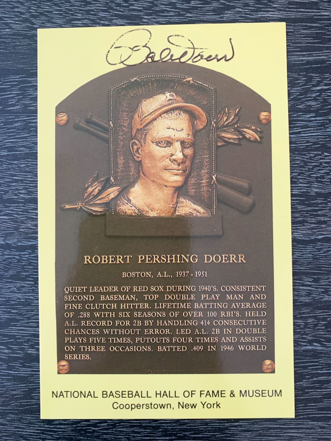 Bobby Doerr signed Baseball Hall of Fame Plaque Postcard. 3x5 inches