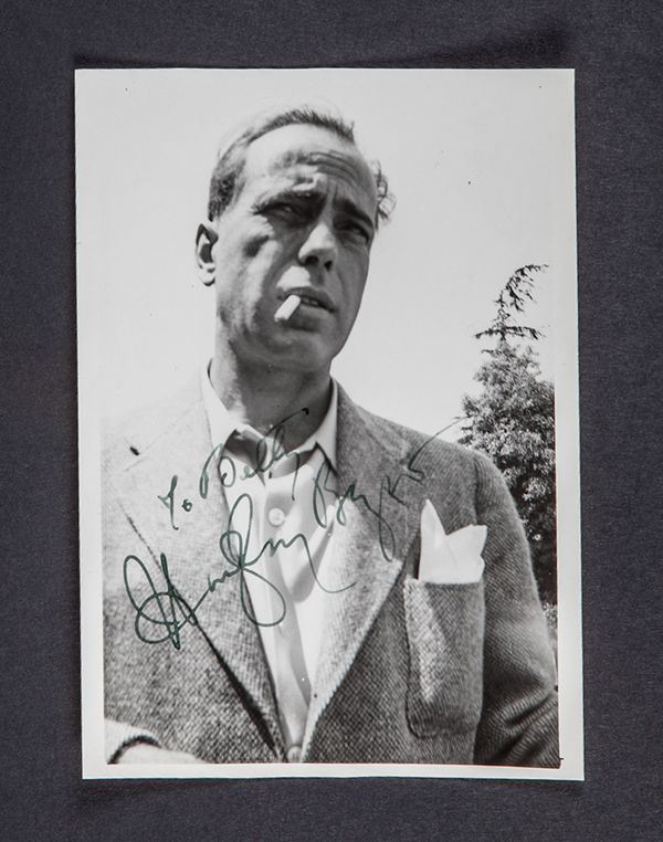 Bogart, Humphrey. Black and white 3� x 5 in. candid photo signed and inscribed "To Betty / Humphrey Bogart." Betty was a Beverly Hills resident who during the 1940s and 50s took many candid photos of the celebrities she saw around town and then got them to sign for her. This waist-length photo shows Bogart with the typical cigarette dangling from his mouth.