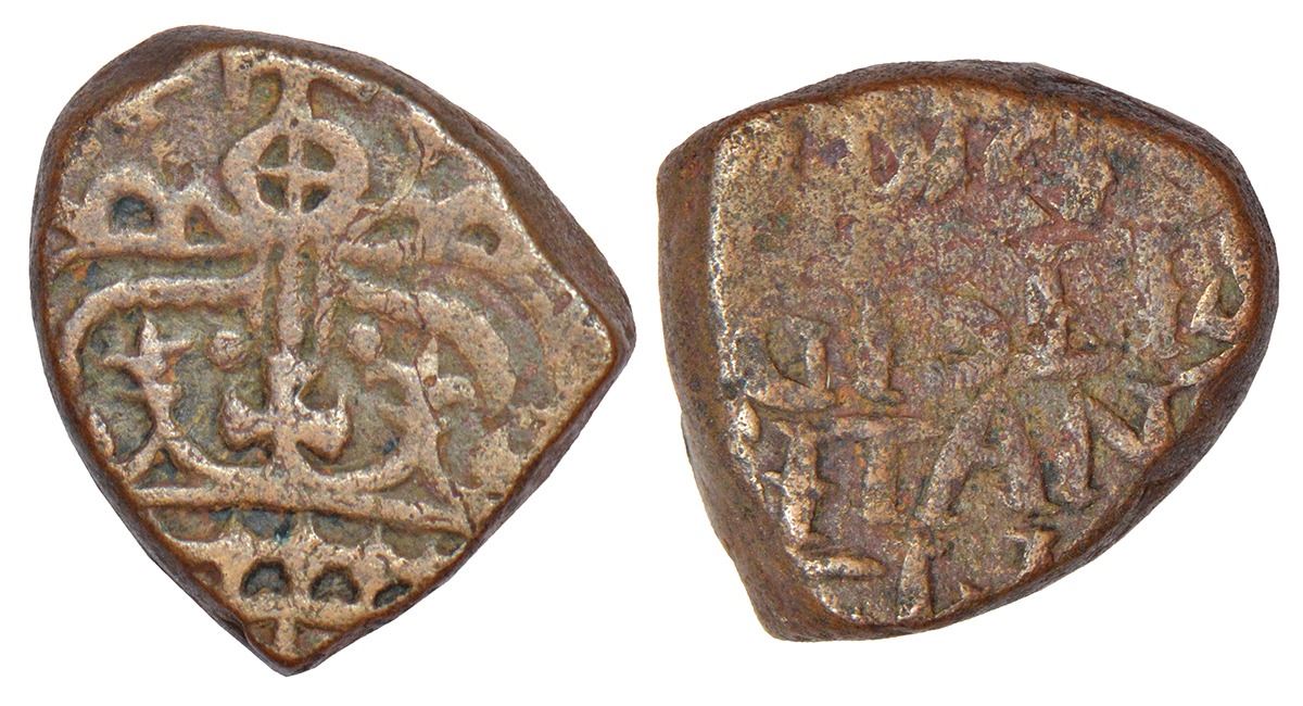 Bombay Presidency, Bombay mint, early coinage, copper pice, ND (1705-16 AD), Stevens EIC 1.64, 13.55g. Obv: Crown topped by orb and cross. Rev: Muddled inscription AUSPICIO/REGIS ET/SENATUS/ANGLICI.