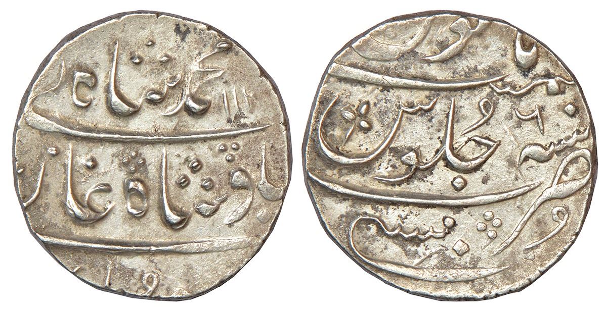 Bombay Presidency, Mumbai mint (full mint name visible), silver rupee, in the name of Muhammad Shah, AH 113x/RY 6, broad flan, 26.26mm, Stevens EIC 2.23-2.24, 11.52g.