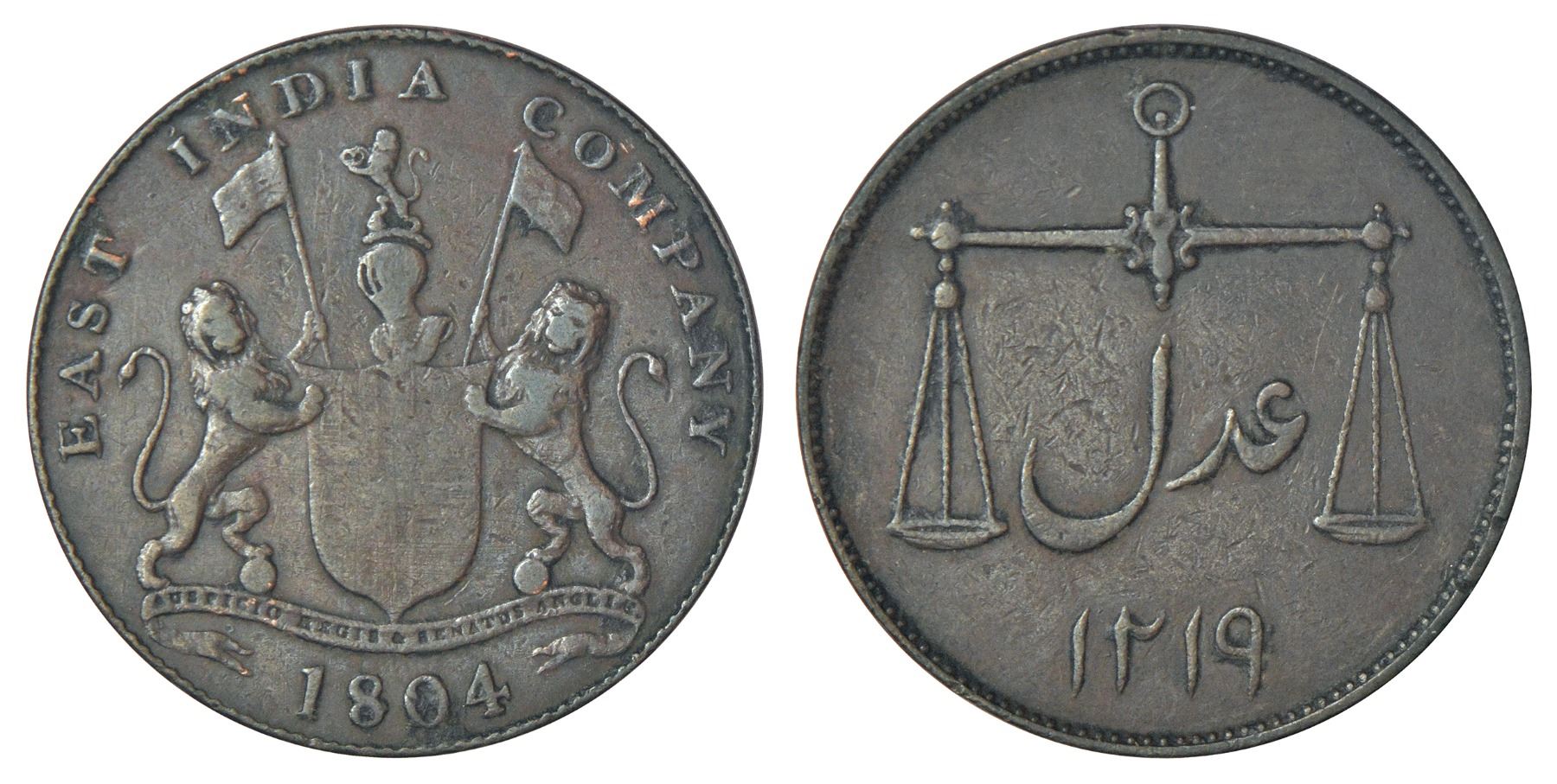 Bombay Presidency, Soho mint, copper 2 pice, AD 1804, Stevens EIC 8.53, 12.83g. Obv: E.I.C. arms, below date. Rev: Scales and Persian adil, below AH 1219.