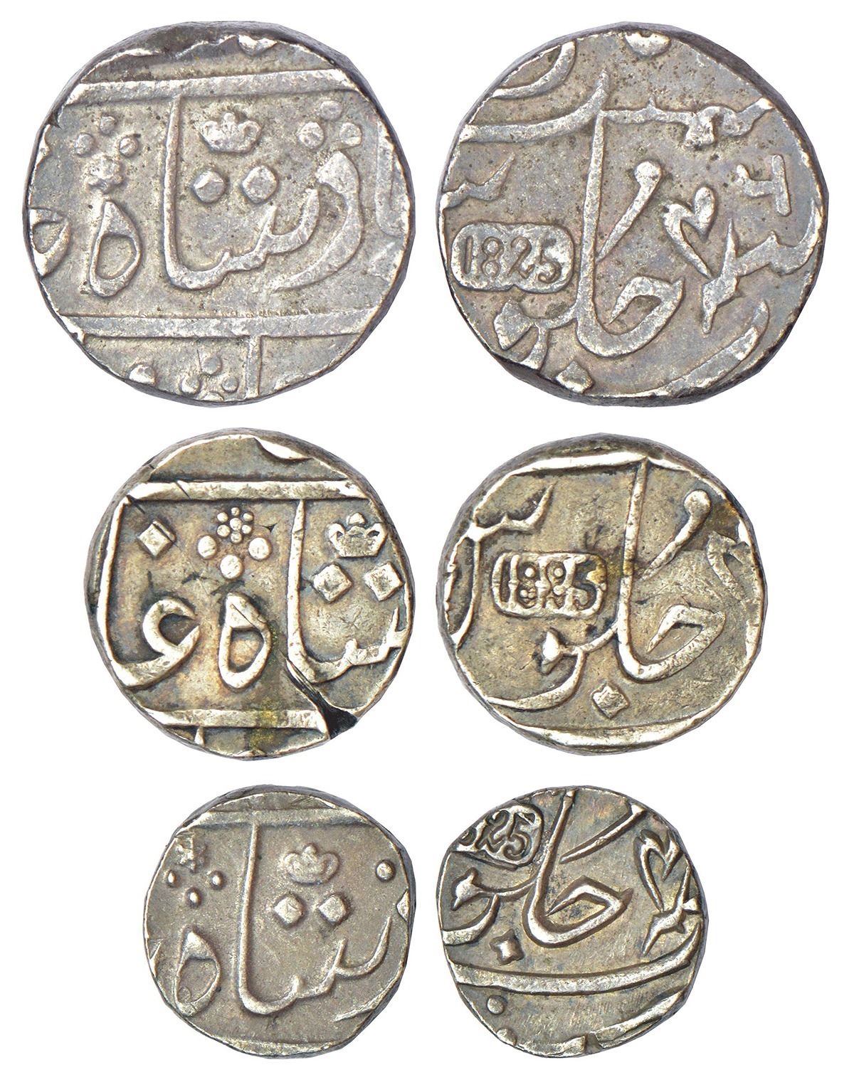 Bombay Presidency, Surat mint (off flan), set of 3 silver coins, 1825 AD, rupee, 11.64g, privy mark