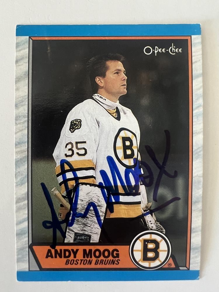 Boston Bruins Andy Moog 1989 O-Pee-Chi #160 signed trading card.2x3 inches