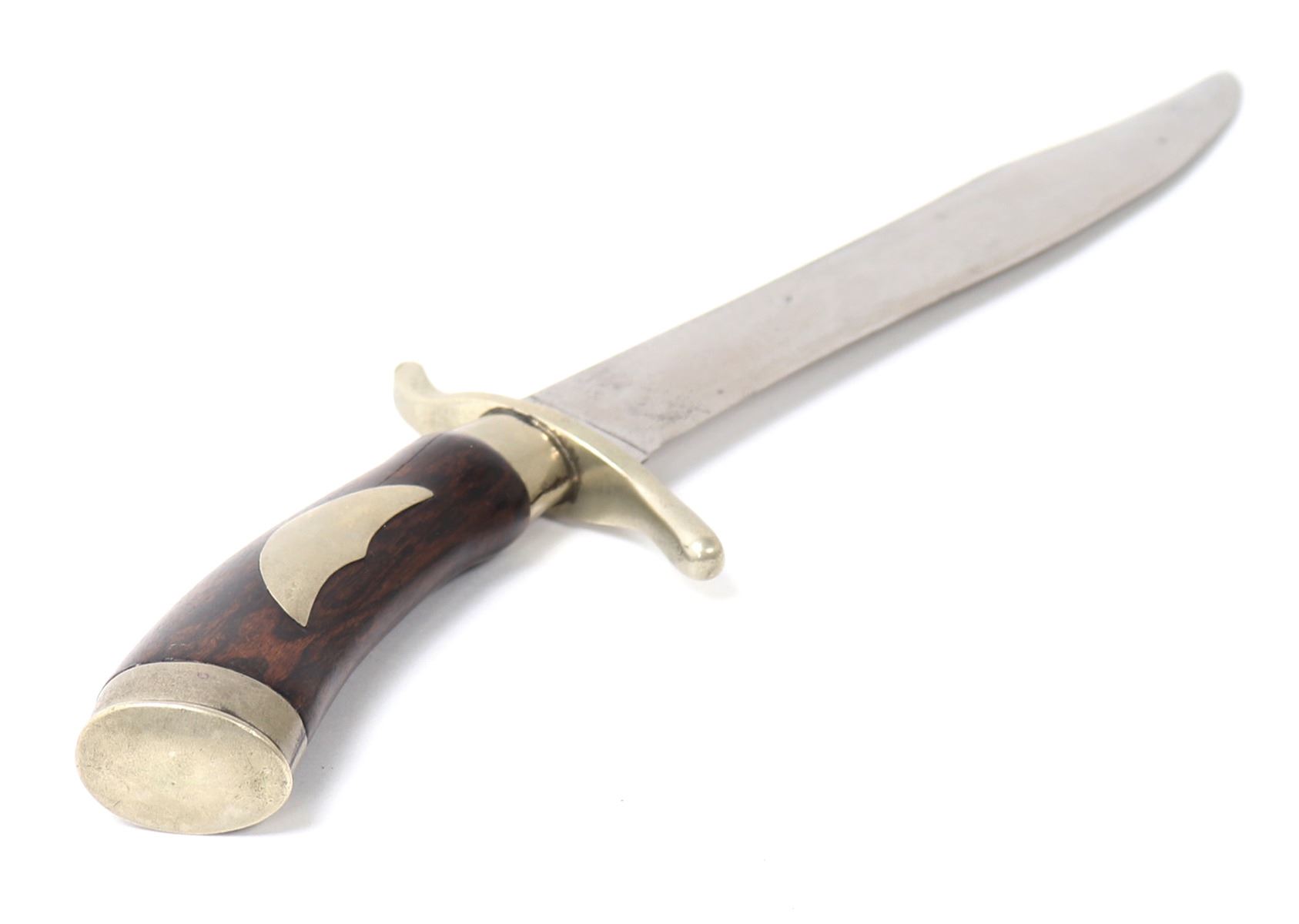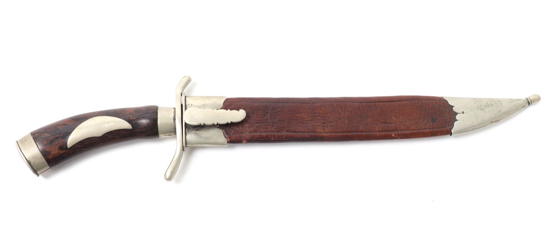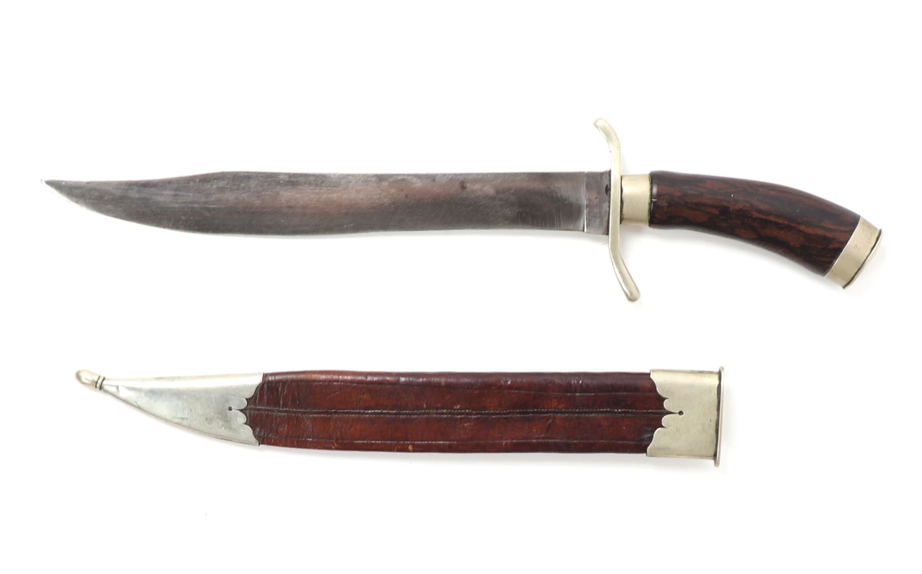 Nice silver mounted or nickel plated bowie hunting knife. Dark wood handle inset with a silver moon and silver upper and lower mounts. Guard and scabbard mounts in silver with a belt hook. Bowie single edge blade with a double edged tip section. Size 16 1/2" L, blade 9 3/4" L.. Condition: Well preserved overall condition.. Provenance: Ex-USA Collection