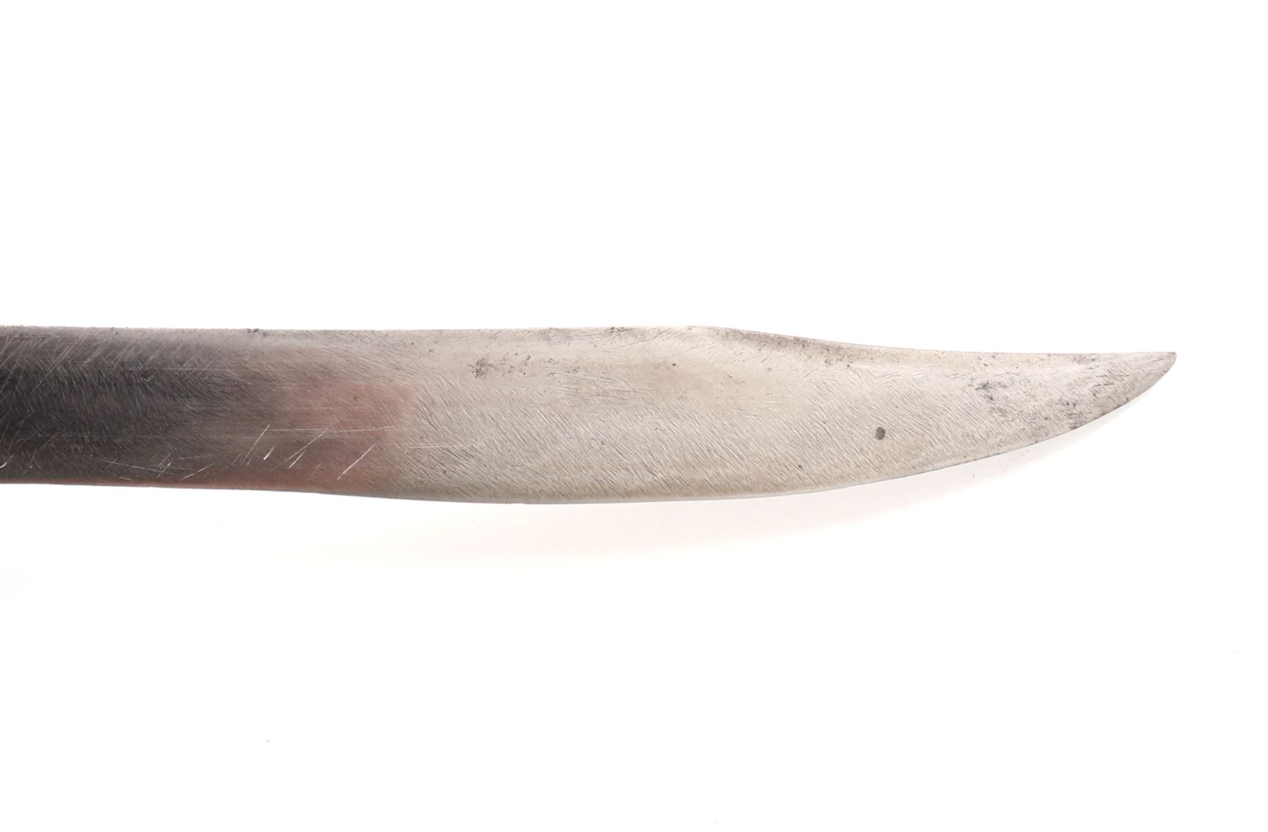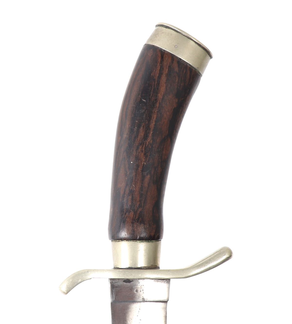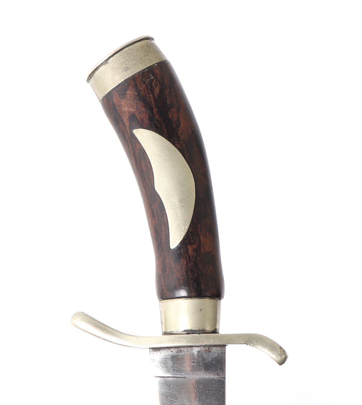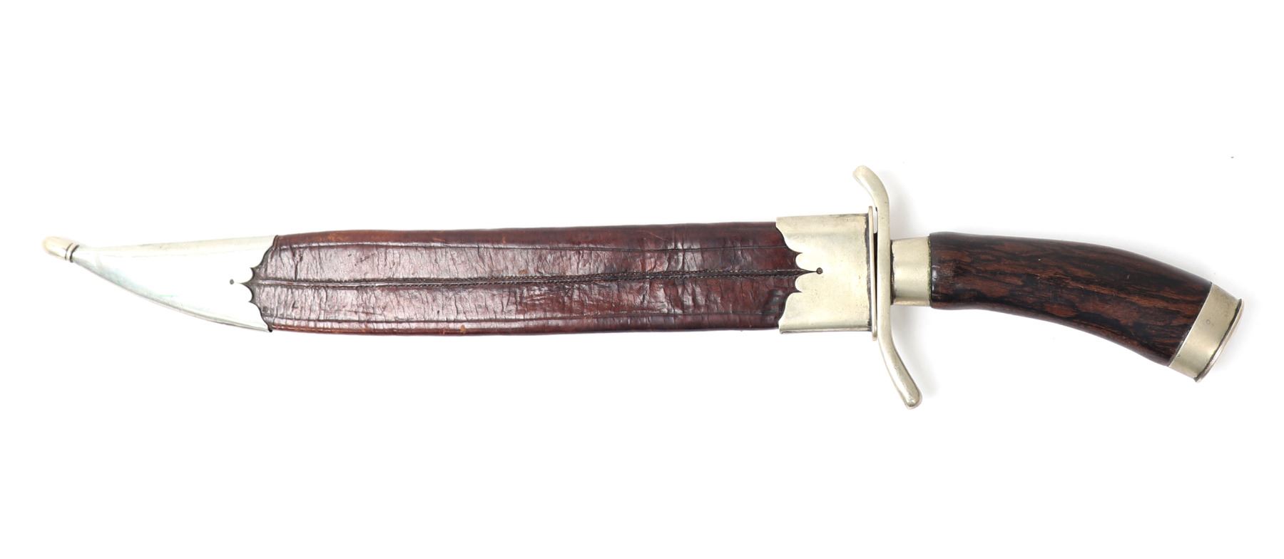Nice silver mounted or nickel plated bowie hunting knife. Dark wood handle inset with a silver moon and silver upper and lower mounts. Guard and scabbard mounts in silver with a belt hook. Bowie single edge blade with a double edged tip section. Size 16 1/2" L, blade 9 3/4" L.. Condition: Well preserved overall condition.. Provenance: Ex-USA Collection