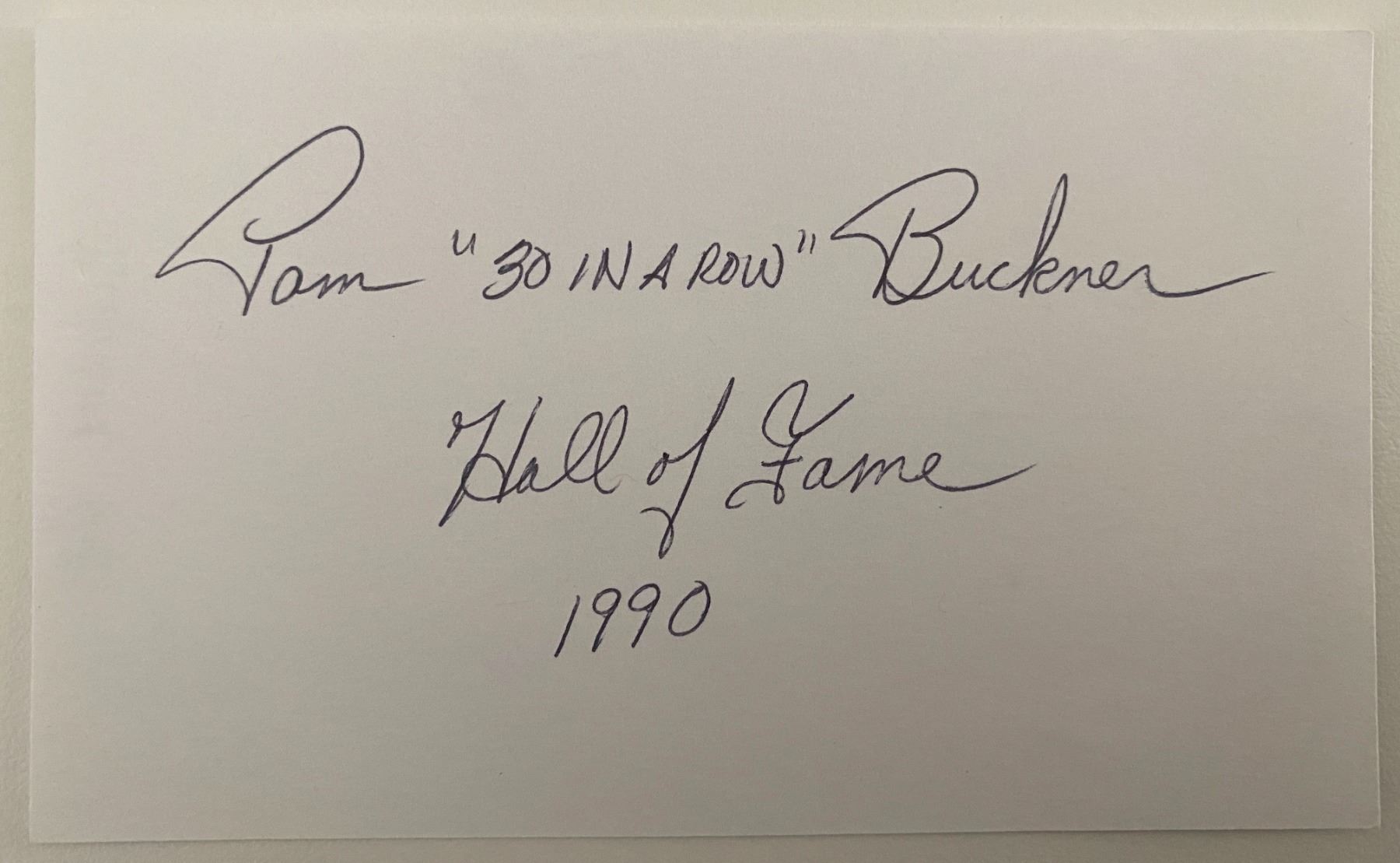 Bowling HOF 1990 Pam Buckner signed note. 3x5inches