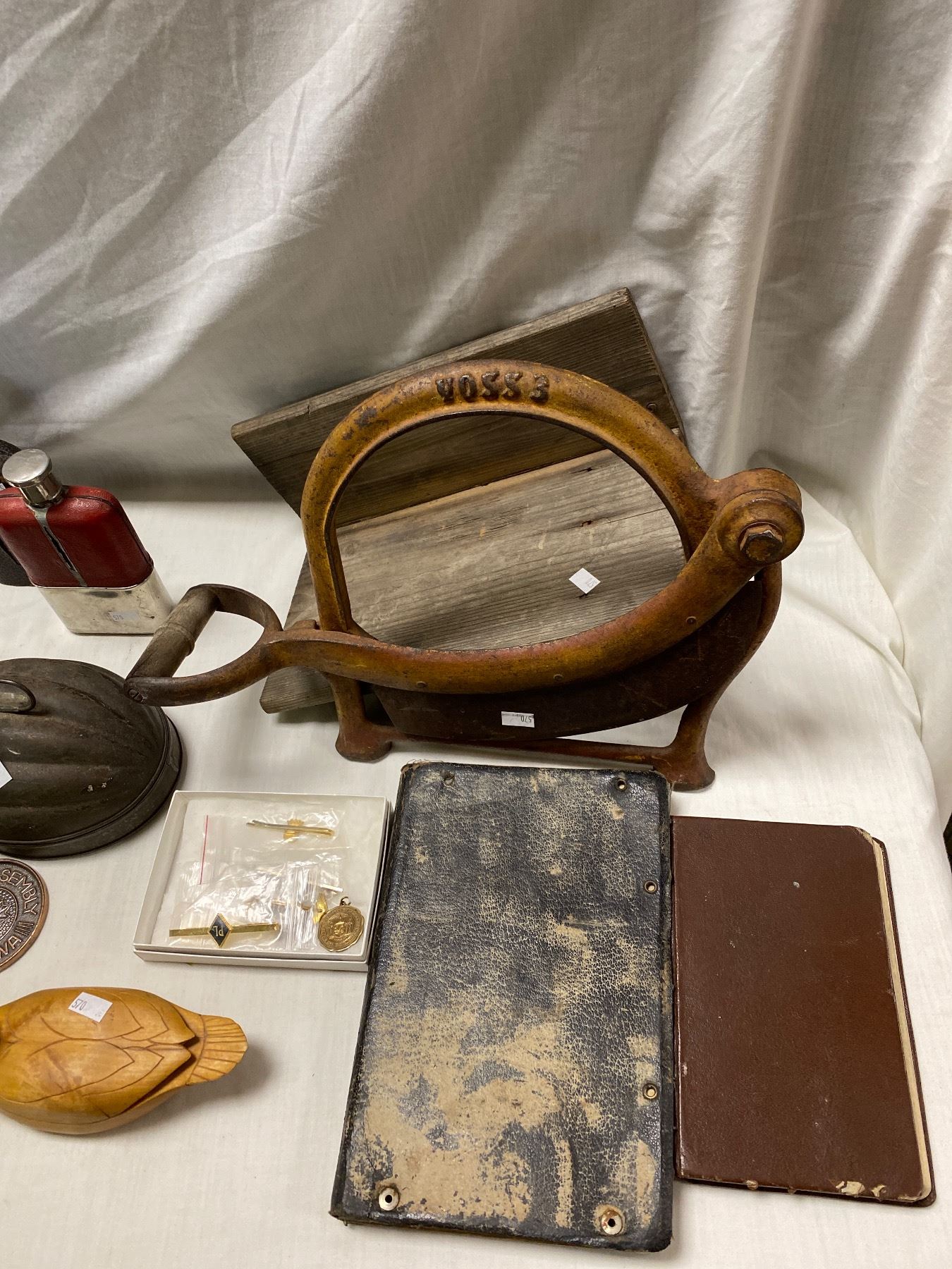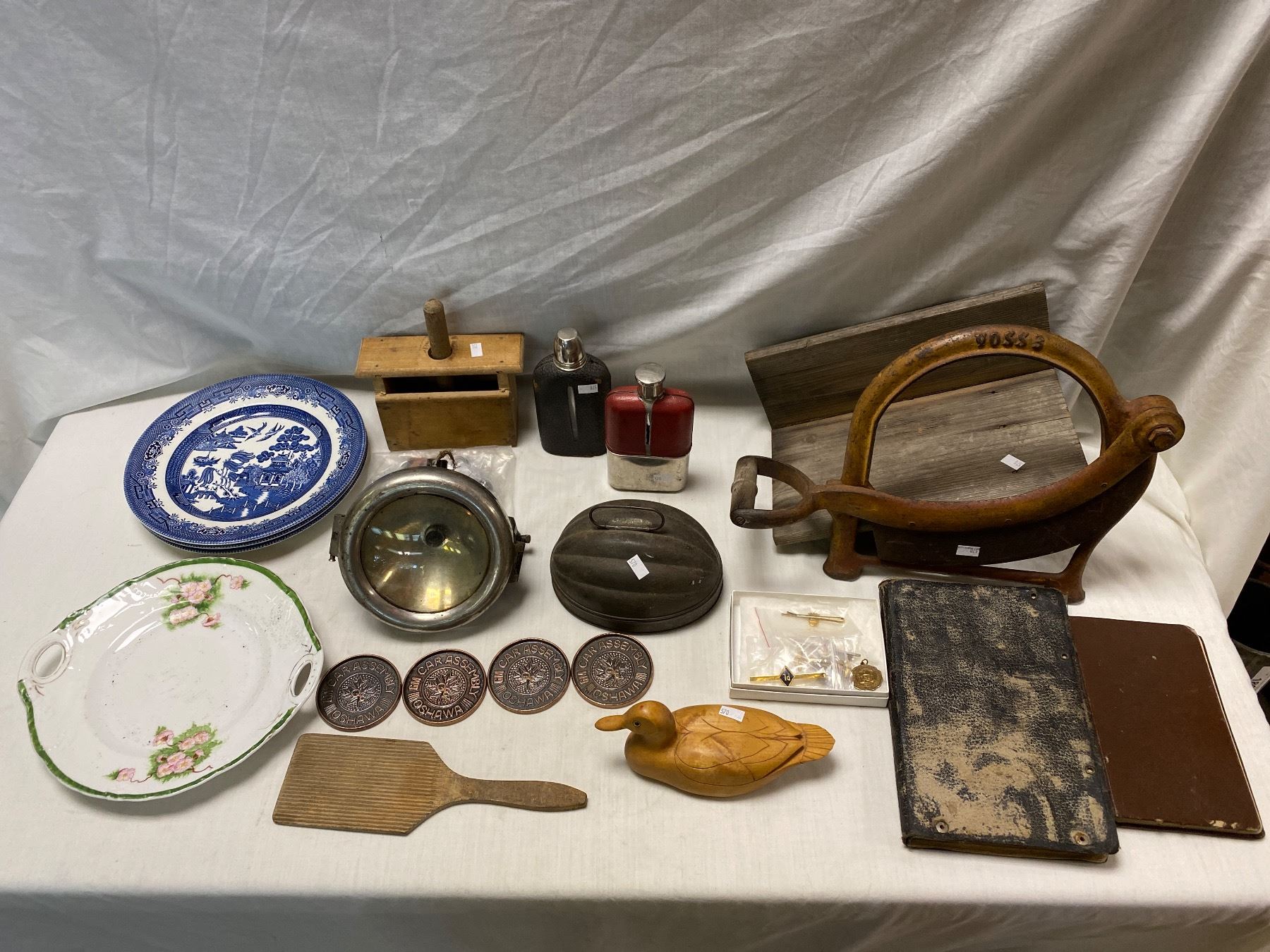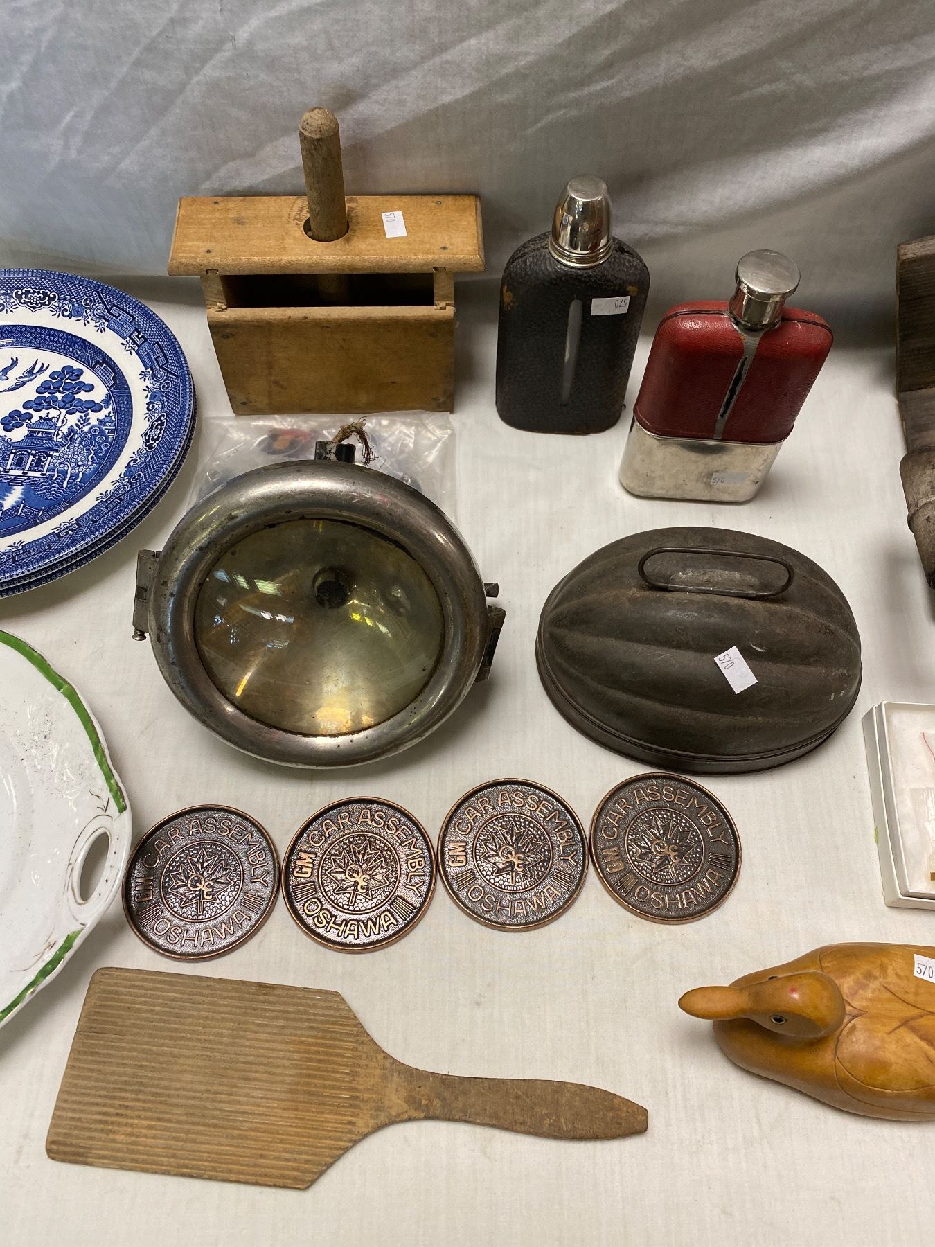 Box Of Vintage Collectibles, Flasks, Plates, Search Light, Duck, Etc..