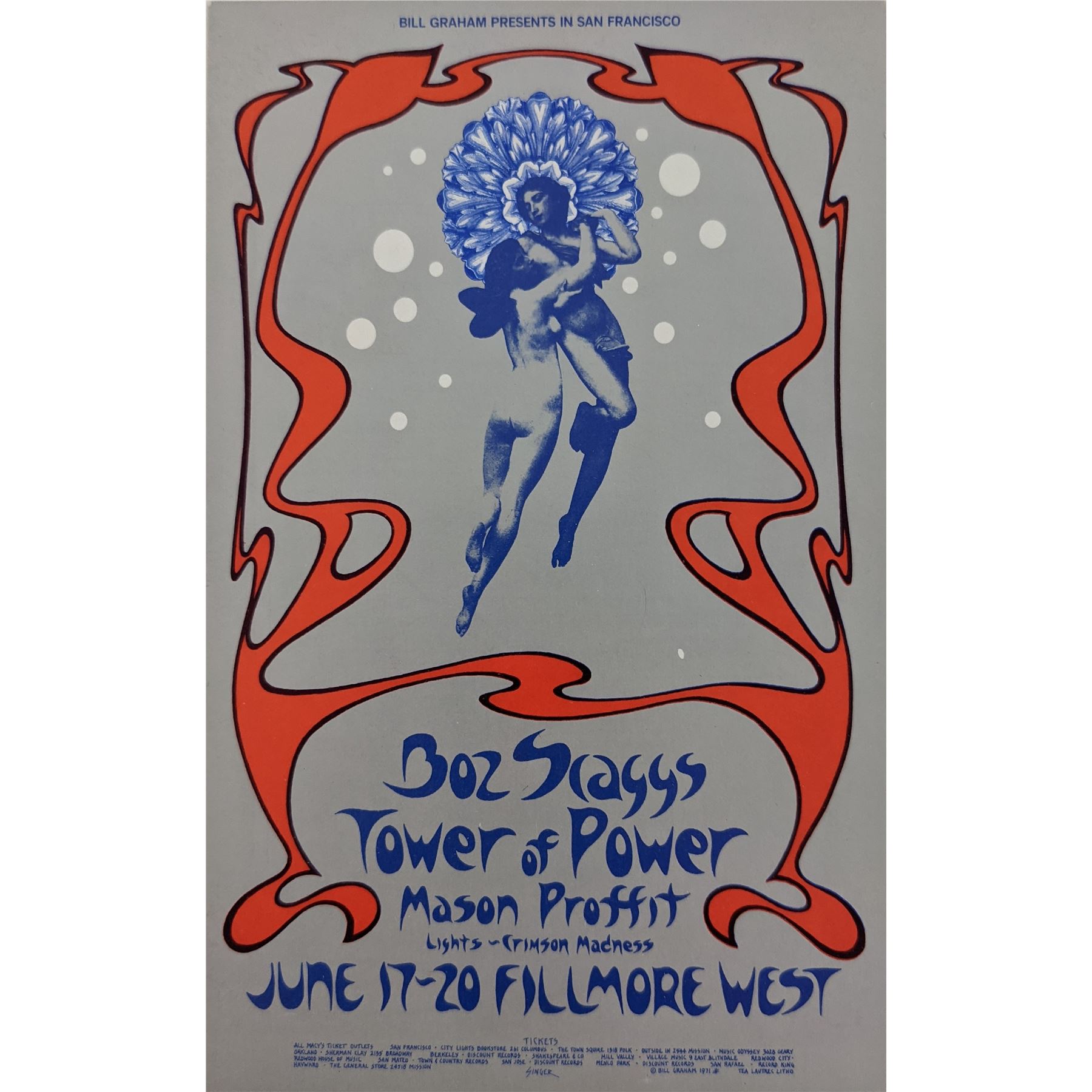 Fillmore West Bill Graham PresentsBozz Scaggs Tower of Power. Poster Design by artist David Singer; Light show by Mason Proffit.