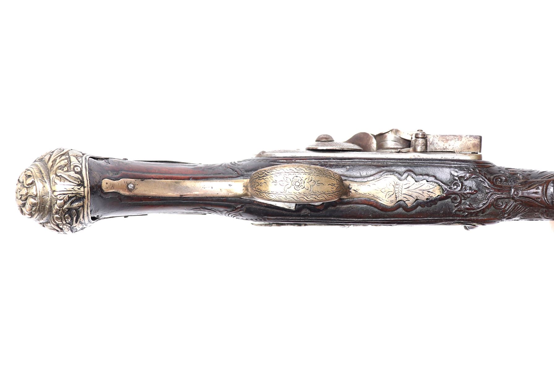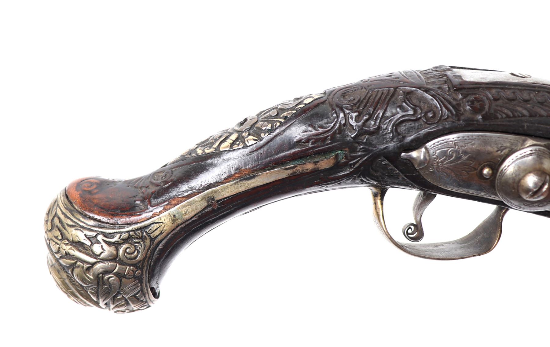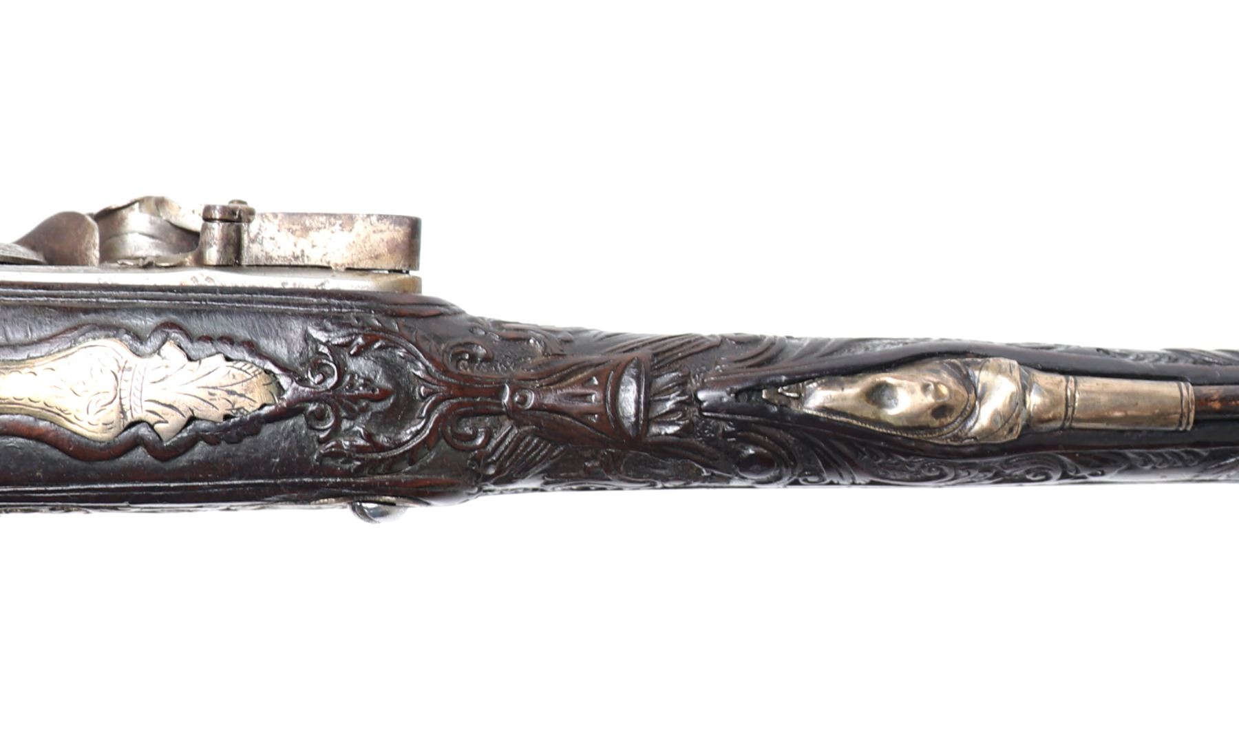 Late 18th century heavy and well carved pair or brace of cavalry pistols for the markets of eastern Europe, Greece and Italy. Each stock of dark wood ornatly carved with highly detailed images of scrolling and floral patterns. Silver cast panels throughout inlaid with motifs of panoply of arms among scrolling. Engraved flintlock lock plate and curlicue trigger. Large caliber bore barrels. Size 20" L, barrel 13 1/2" L. Provenance: Ex-USA Collection