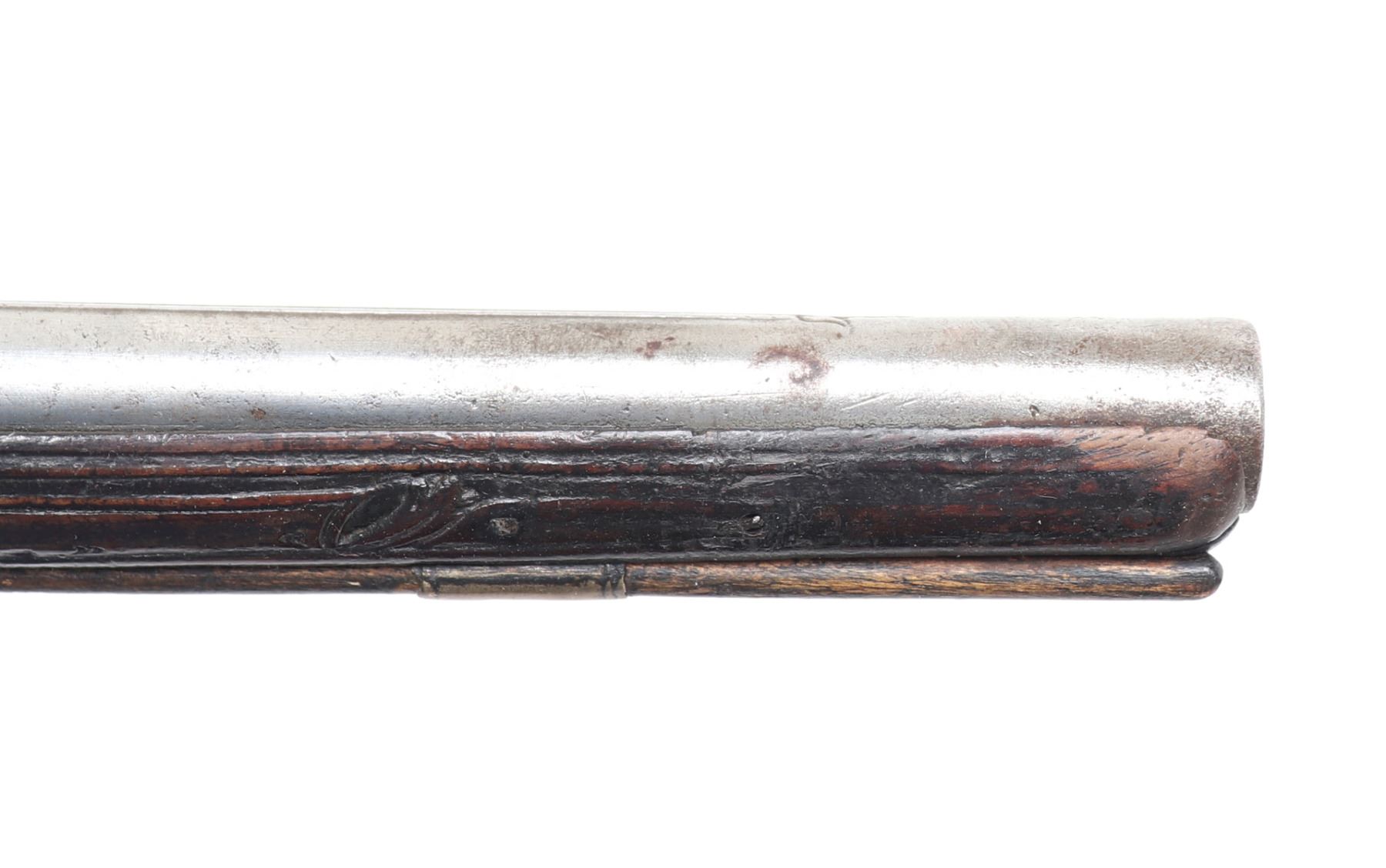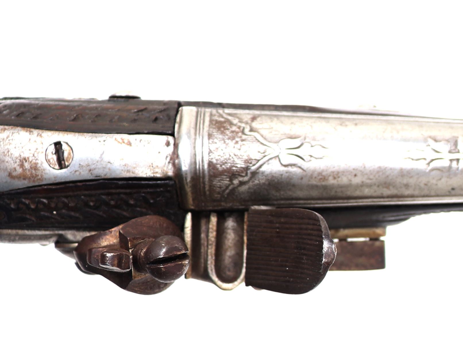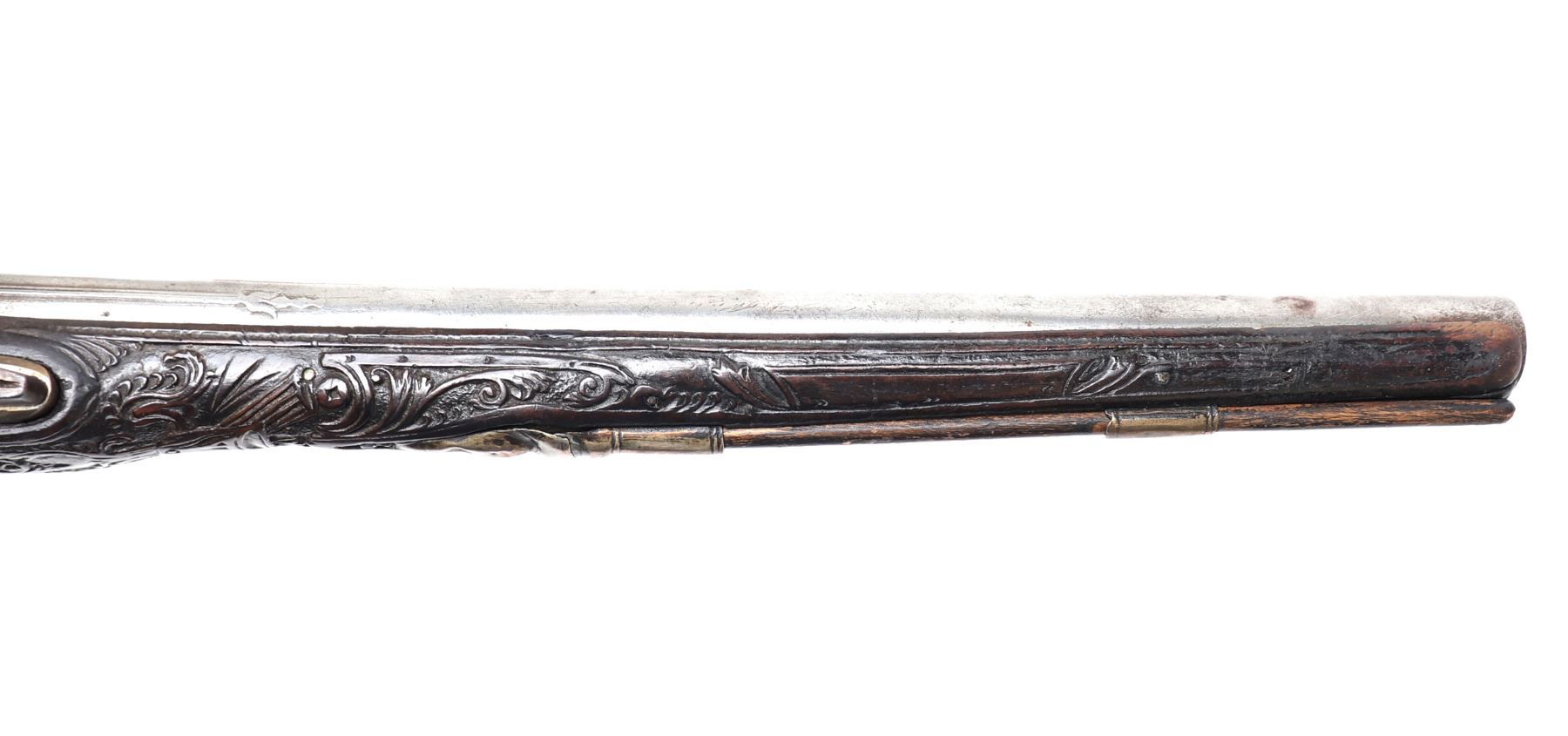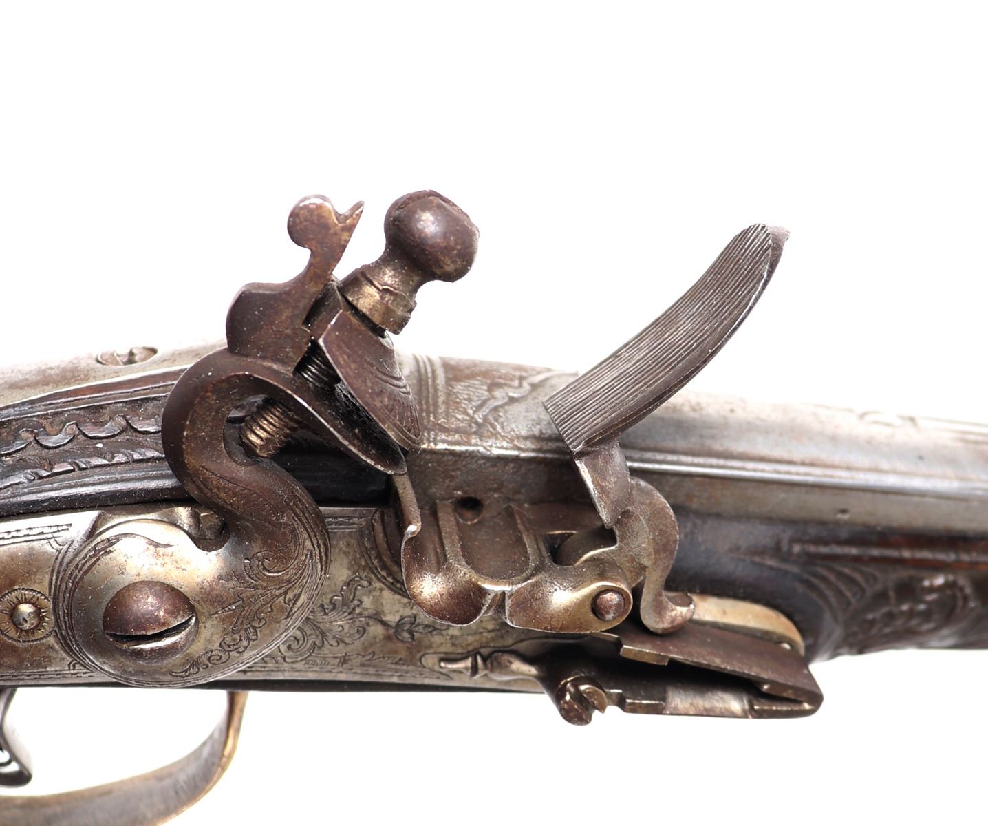 Late 18th century heavy and well carved pair or brace of cavalry pistols for the markets of eastern Europe, Greece and Italy. Each stock of dark wood ornatly carved with highly detailed images of scrolling and floral patterns. Silver cast panels throughout inlaid with motifs of panoply of arms among scrolling. Engraved flintlock lock plate and curlicue trigger. Large caliber bore barrels. Size 20" L, barrel 13 1/2" L. Provenance: Ex-USA Collection